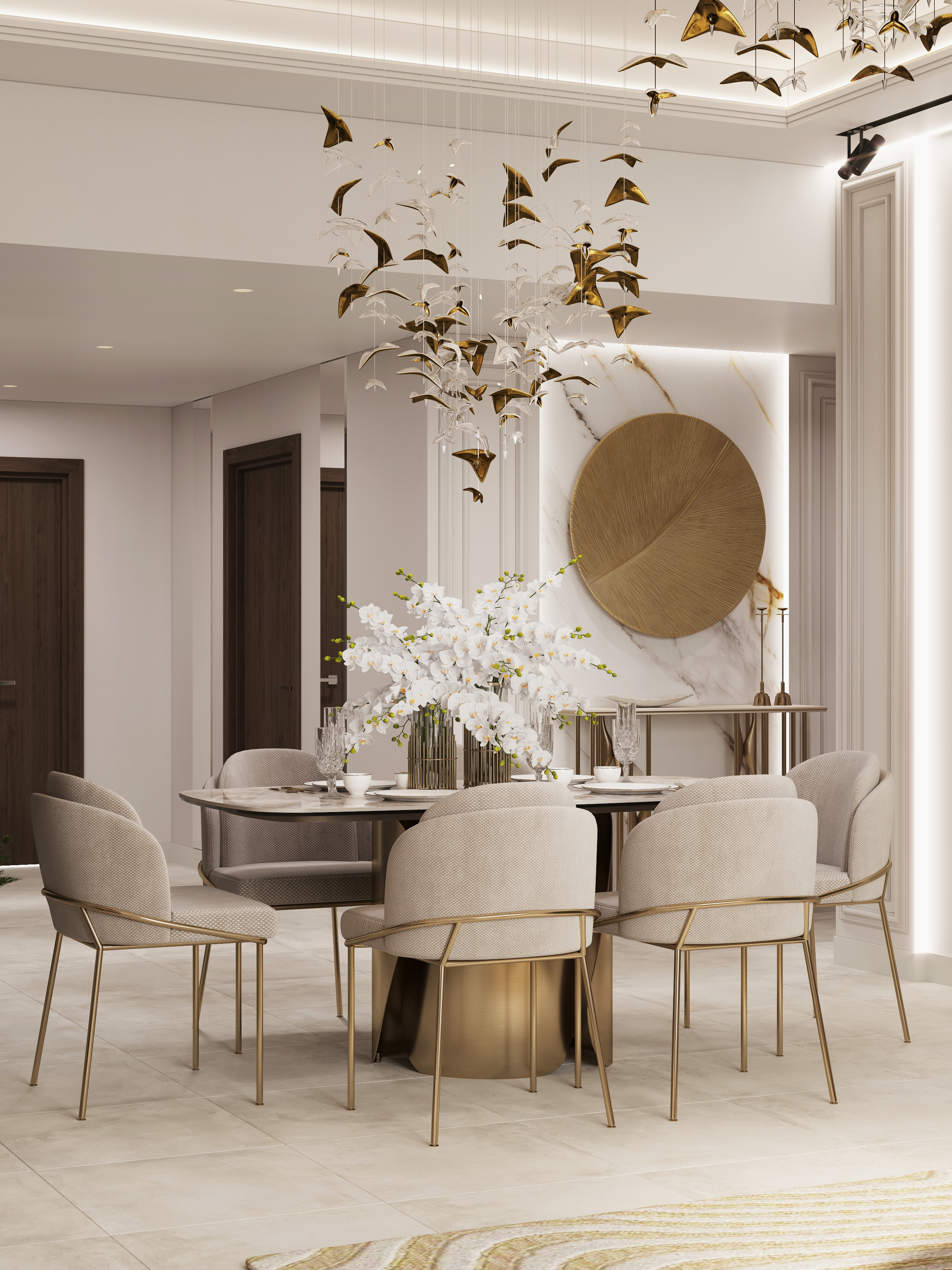 Визуализация гостиной-столовой, в спокойных тонах, с яркими акцентами