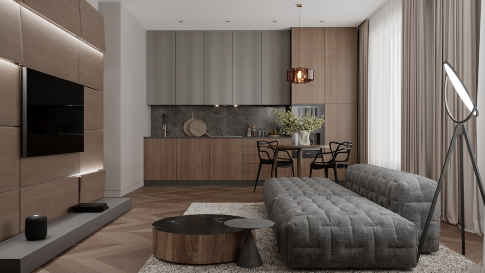 Визуализация интерьера кухни-гостиной.