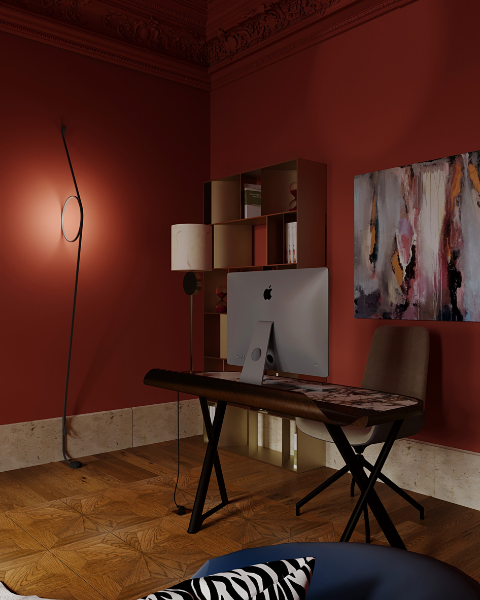 3д визуализация кабинета в квартире старого фонда, с сохранением существующей лепнины. Визуализация выполнена в 3D Max+Corona+PH
