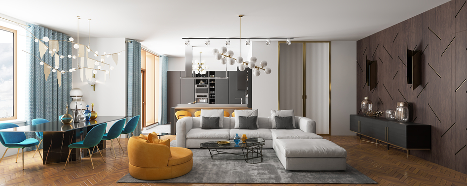 Визуализация кухни-гостиной в квартире в центре Москвы. Дизайнер Ольга Черненко