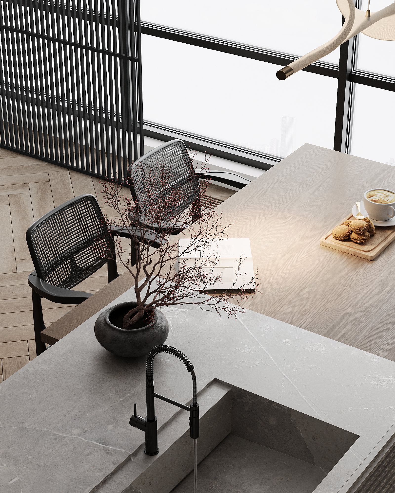 Проект кухни-гостиной разработан в рамках презентации. В рамках концепции важно было создать гармоничный и целостный интерьер помещения.