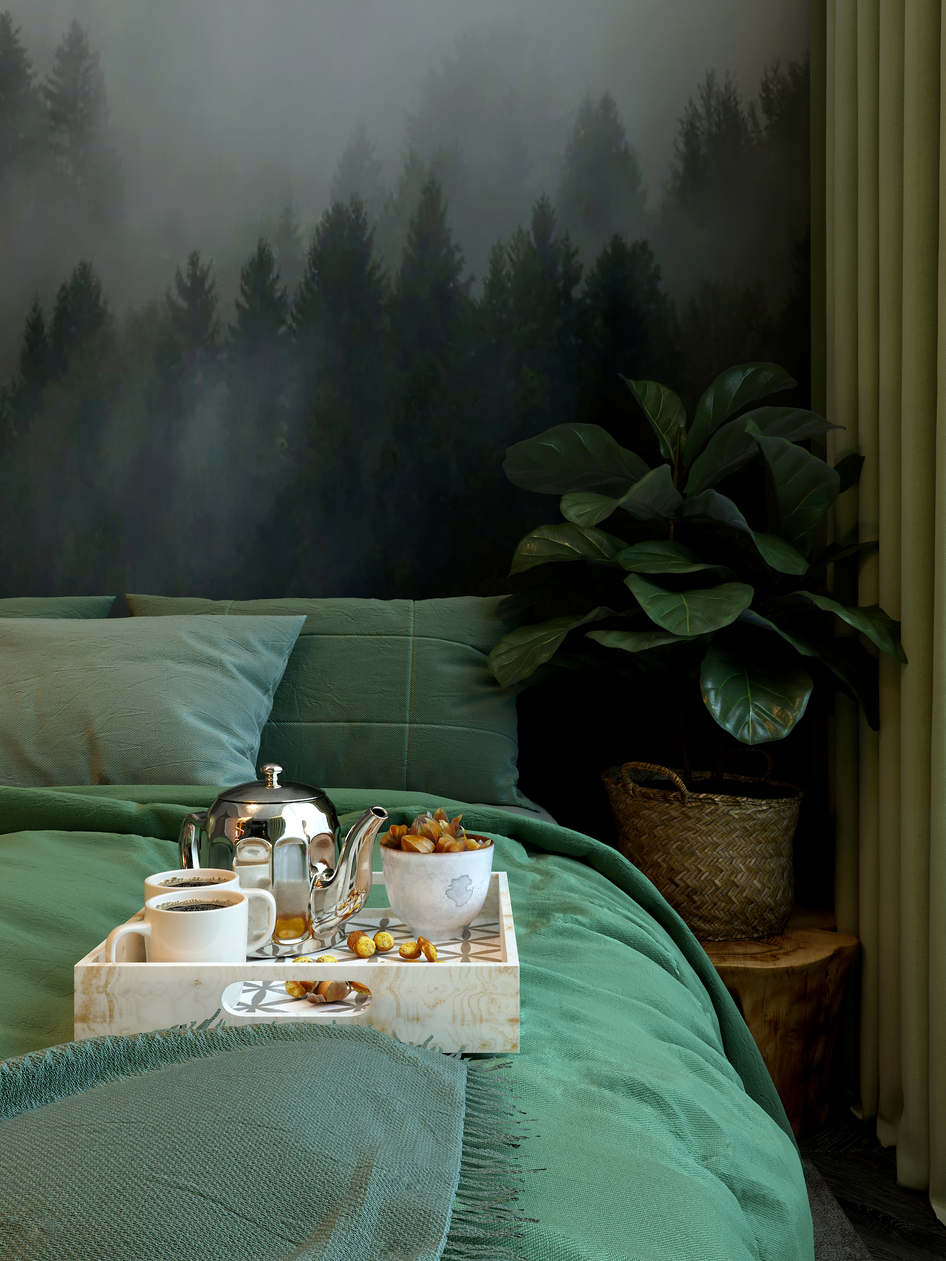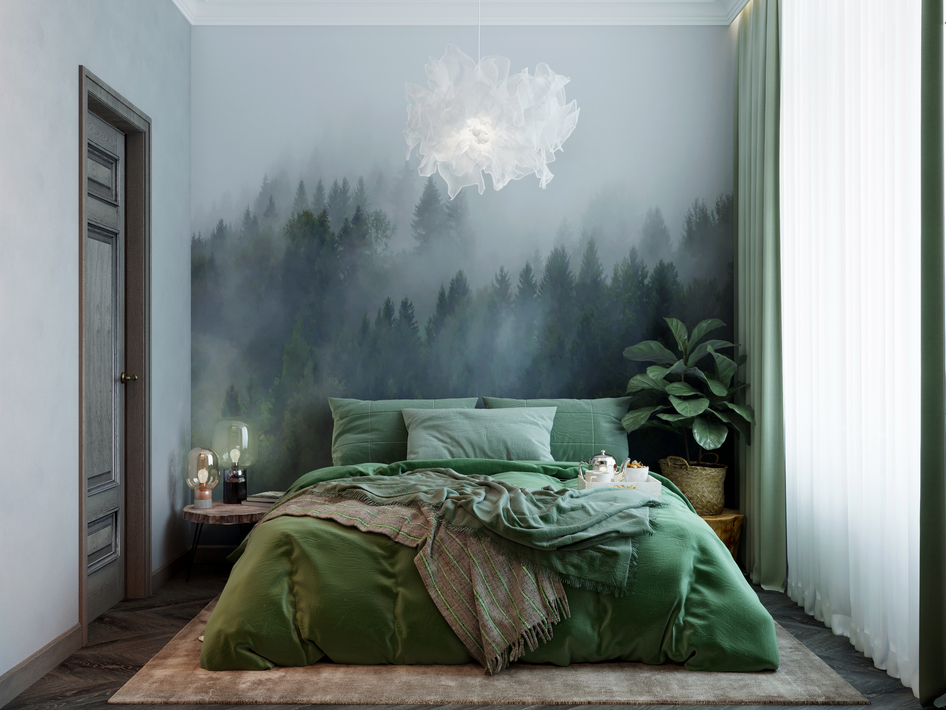 У вас хорошо получилось передать атмосферу, лес на обоях, зеленоватые тона. Спасибо за такой интерьер! :)