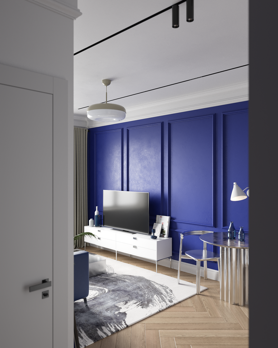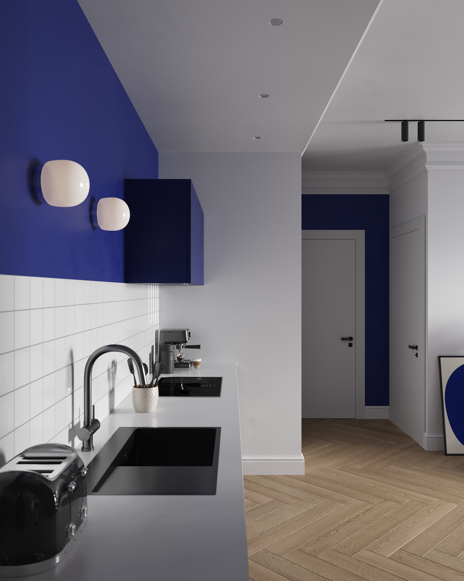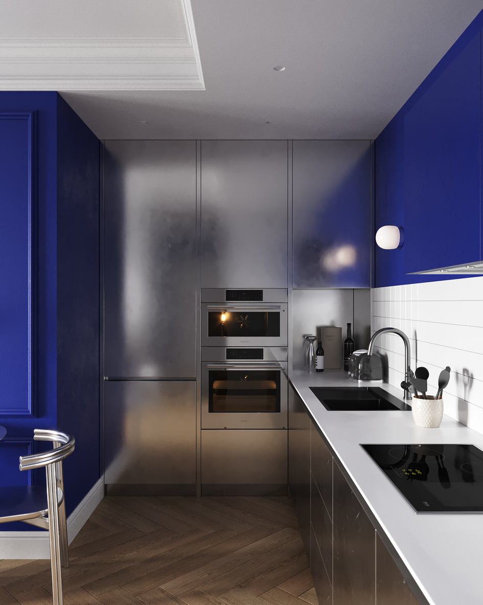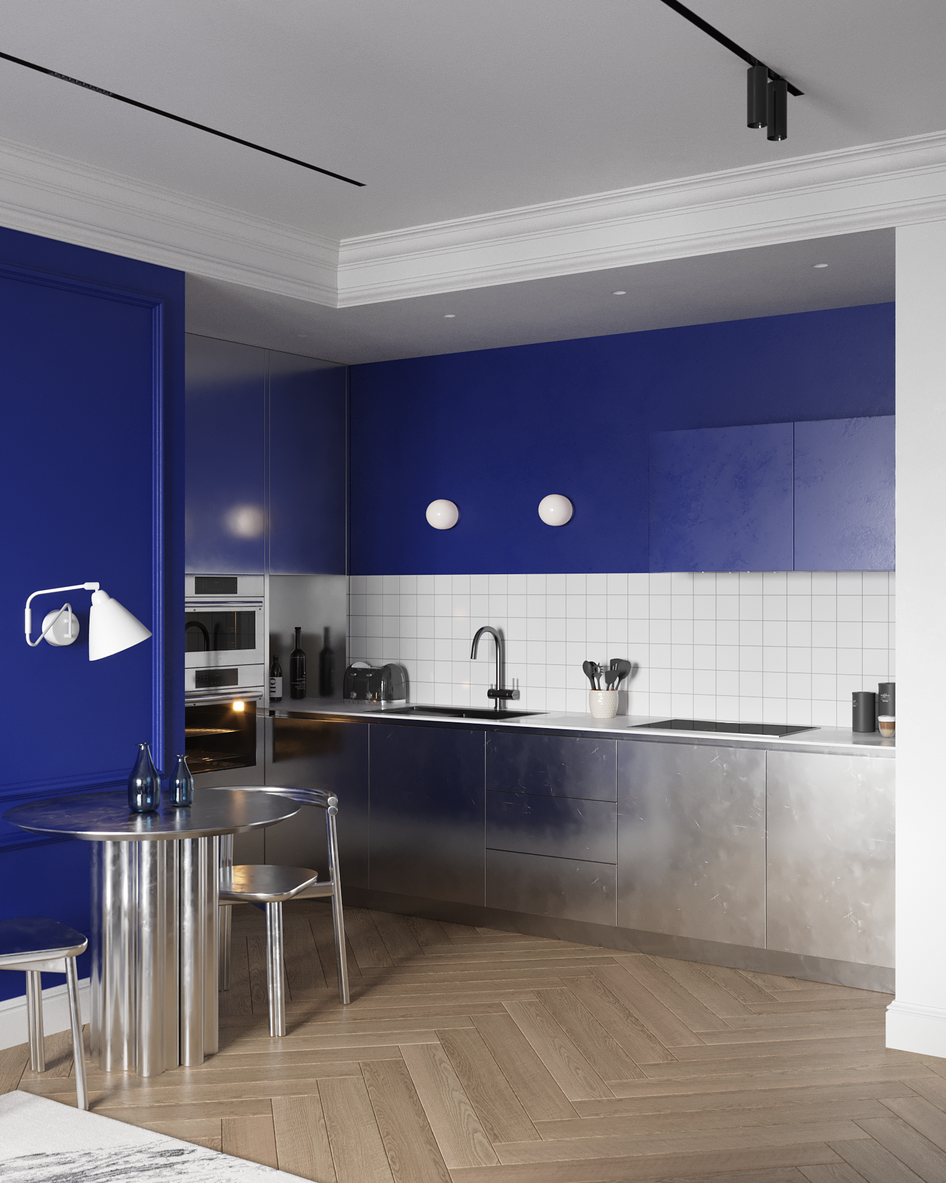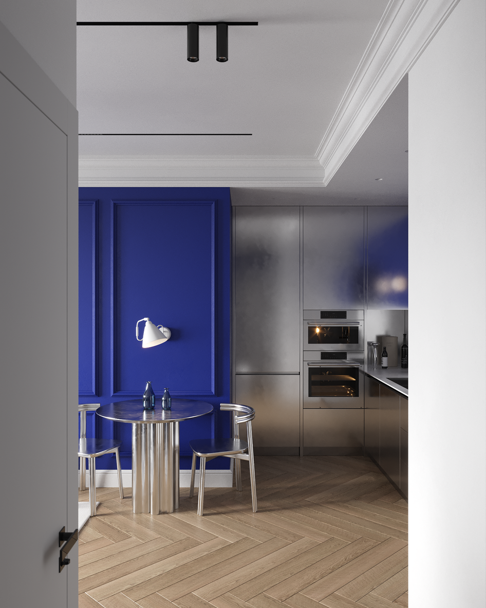 Главный акцент — глубокий синий оттенок стены и металлические фасады кухни, которые выделяют зону столовой и создают выразительный контраст с нейтральной палитрой.