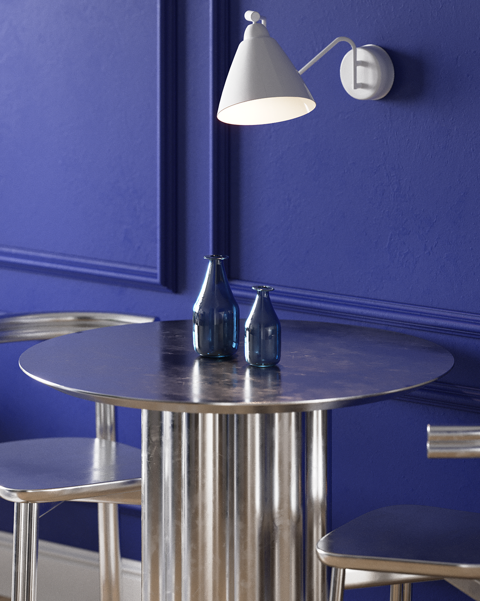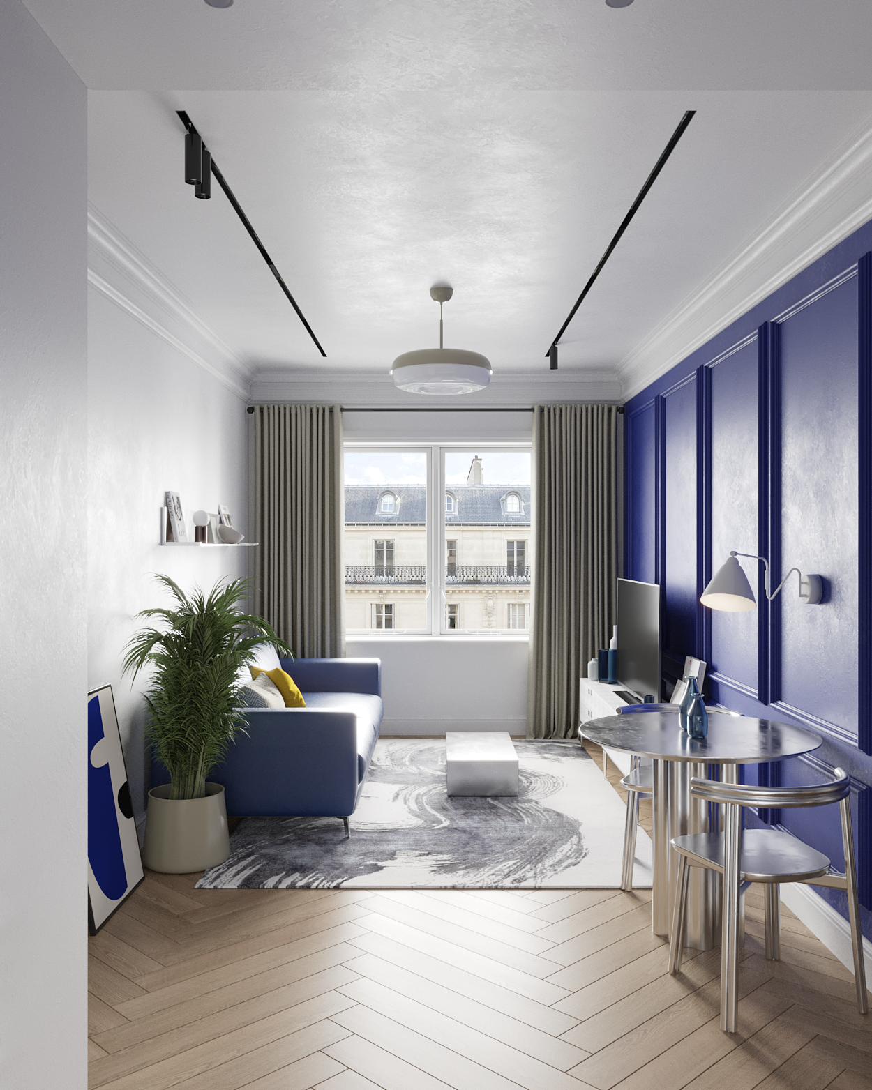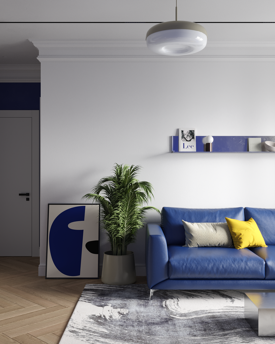 Задачей было сделать визуализацию интерьера, который объединяет классические элементы с современным характером и ярким акцентом.