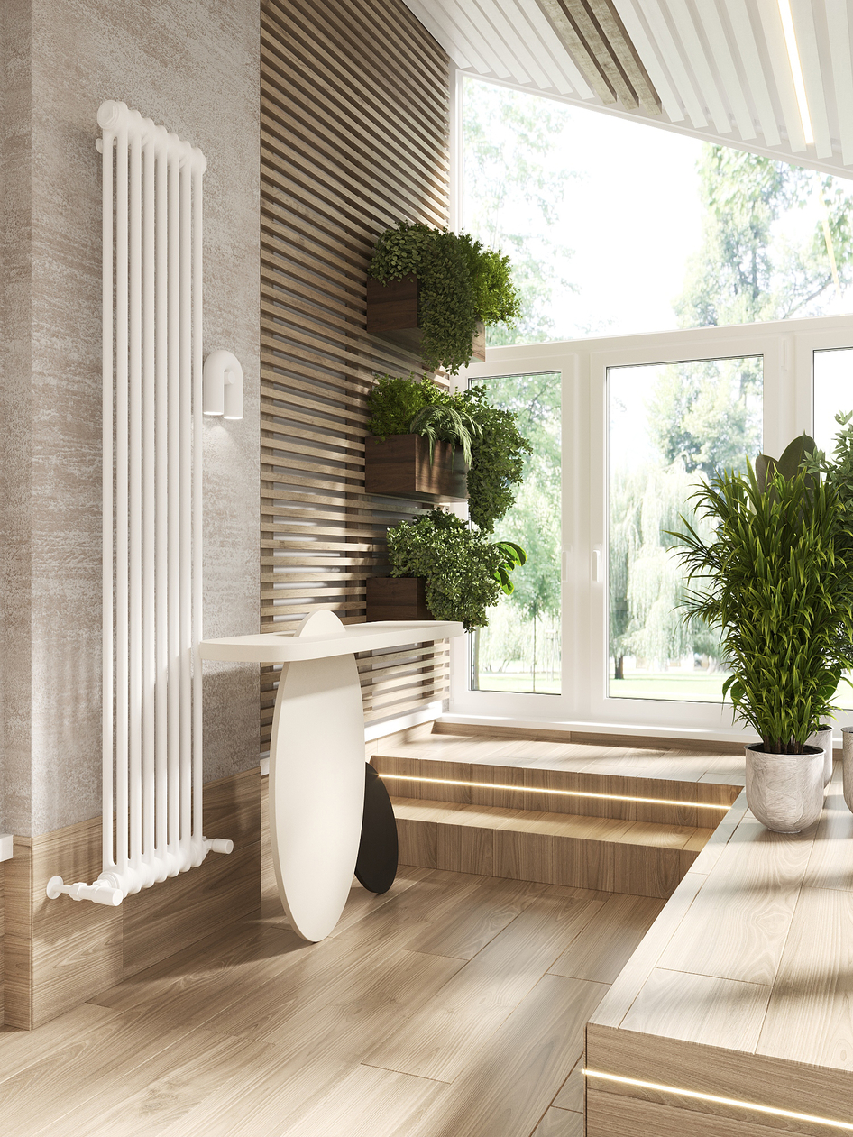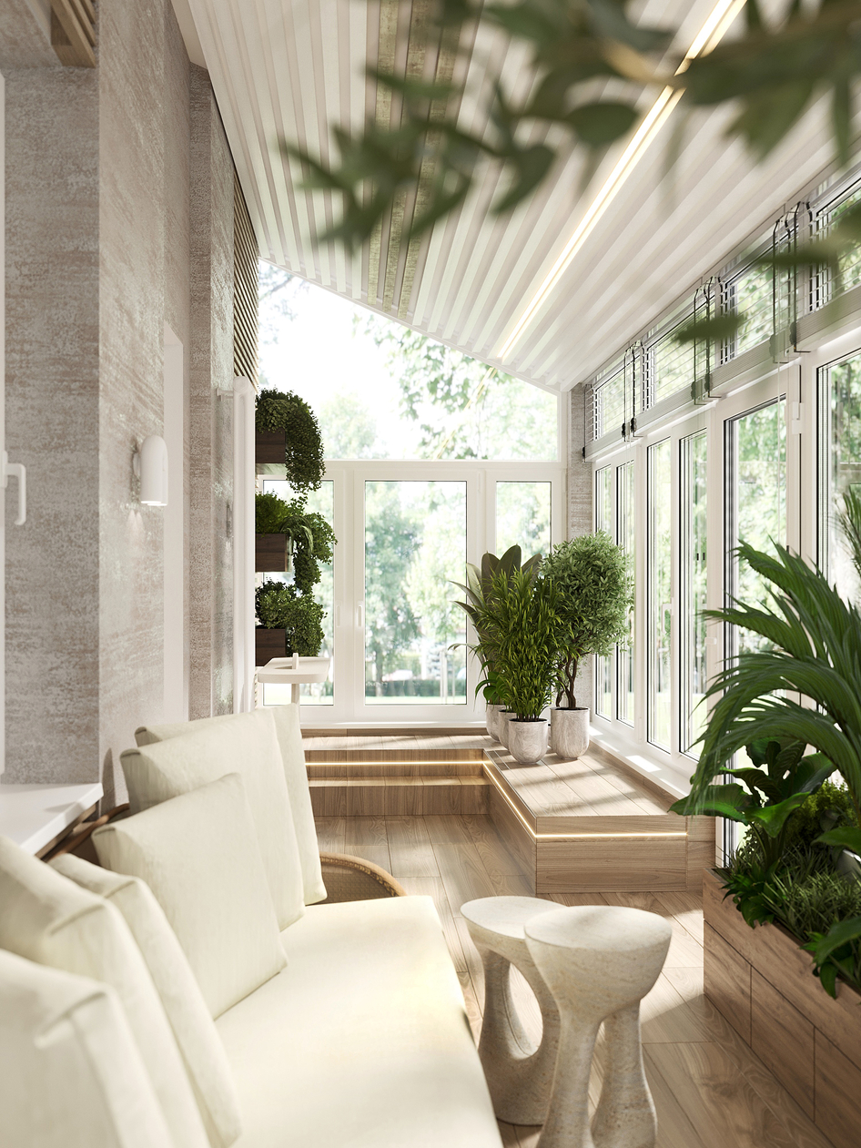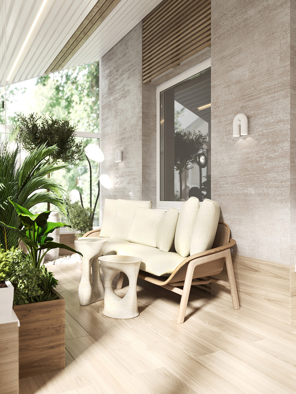 Визуализация террасы с вазонами, дизайнерскими светильниками, столиками и диваном