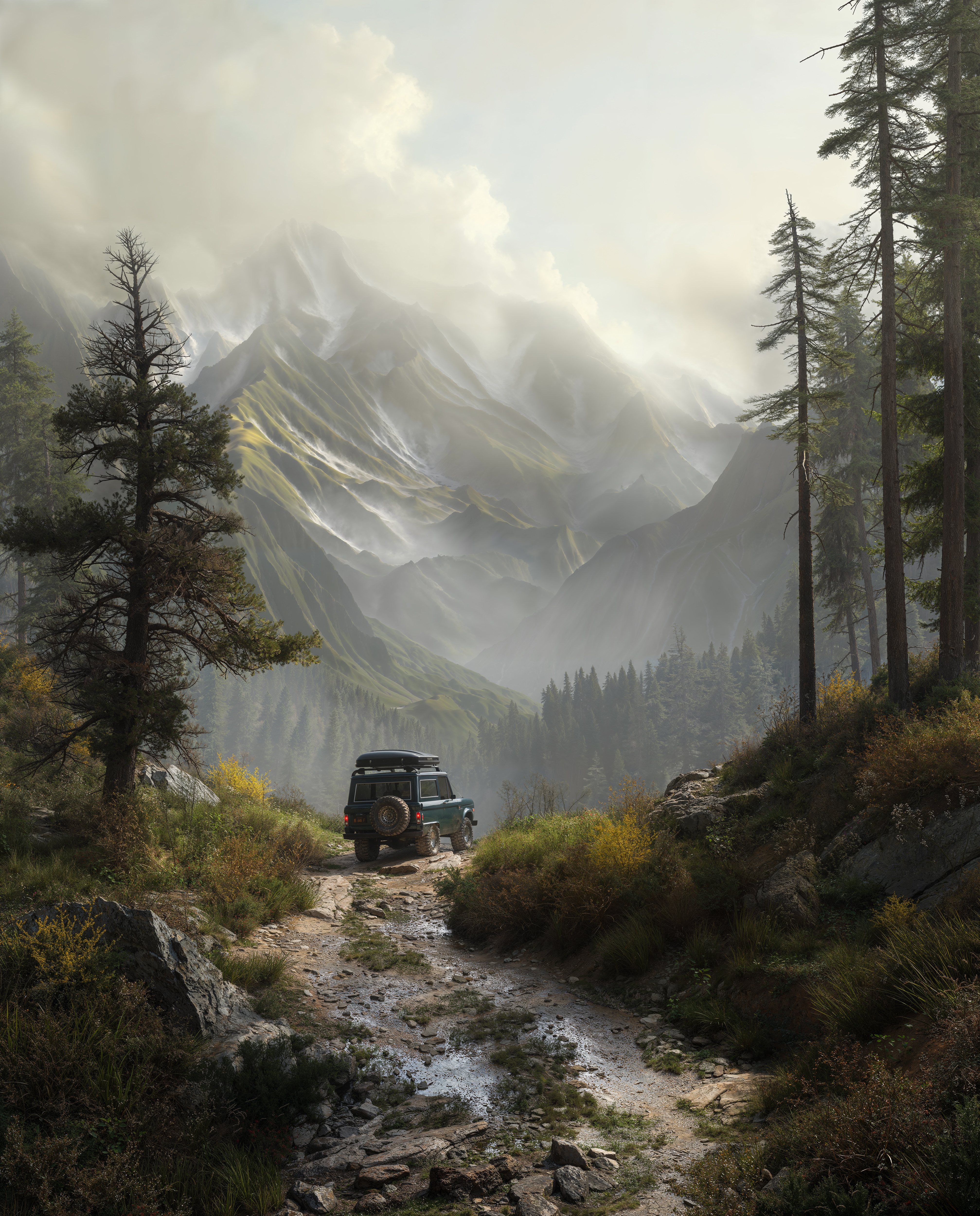 Это моя новая полностью CGI 3D-работа, вдохновленная захватывающей атмосферой картин Альберта Бирштадта. Моя главная цель заключалась в том, чтобы передать величие пейзажей, мягкий свет и кинематографическую глубину. Я хотел создать сцену, которая одновременно ощущается просторной и уютной — словно шаг в мечту о великом путешествии на природе.