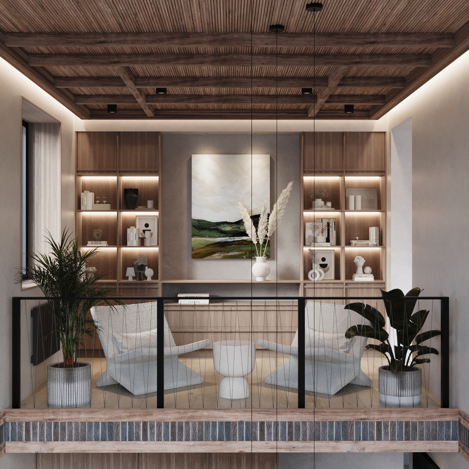 Концепция кухни и гостиной в стиле Ваби-Саби в загородном доме.