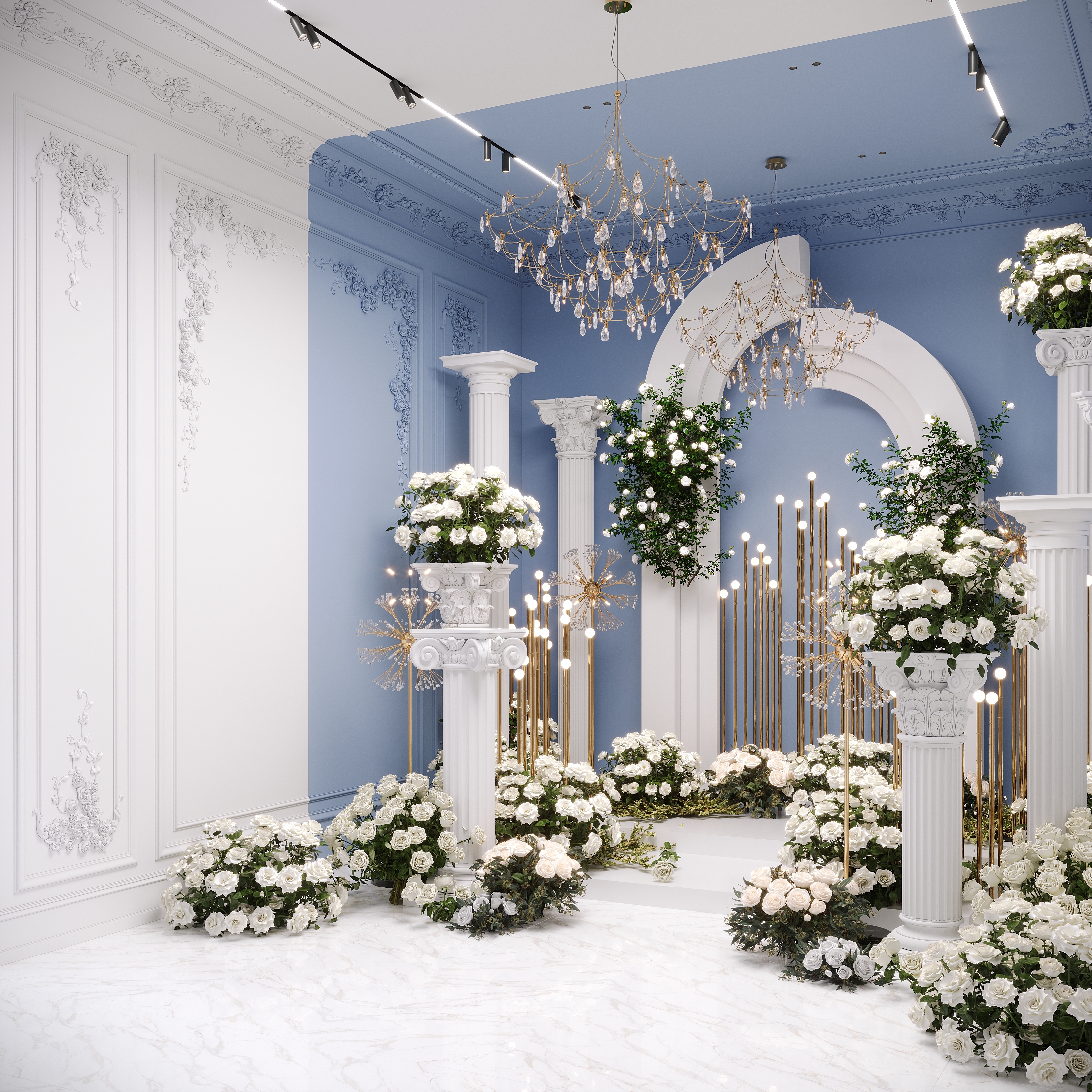 Элегантная фотозона, оформленная в стиле античной классики с элементами современного дизайна. Центральная часть композиции — белая арка на фоне небесно-голубой стены, обрамлённая золотыми световыми инсталляциями. В интерьере доминируют пышные белые розы, размещённые на классических колоннах и у основания арки. Пространство украшено изысканными люстрами с хрустальными подвесками и декоративными золотыми элементами. Атмосфера торжественная, утончённая и идеально подходит для свадебной церемонии или фотосессии.