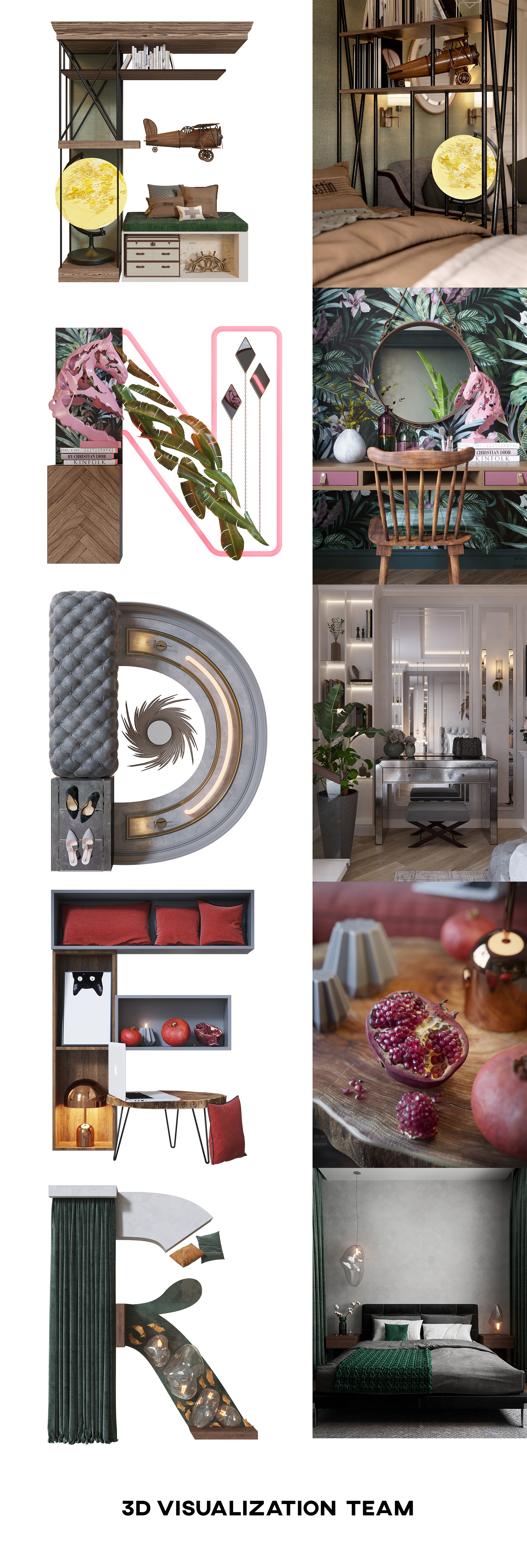Проект был создан для web сайта wonderender.com Мы взяли любимые проекты и собрали из них буквы нашего нового имени -WONDERENDER. В каждую букву мы вложили любовь к графическому дизайну, интерьерной визуализации, цвету, текстурам и свету!