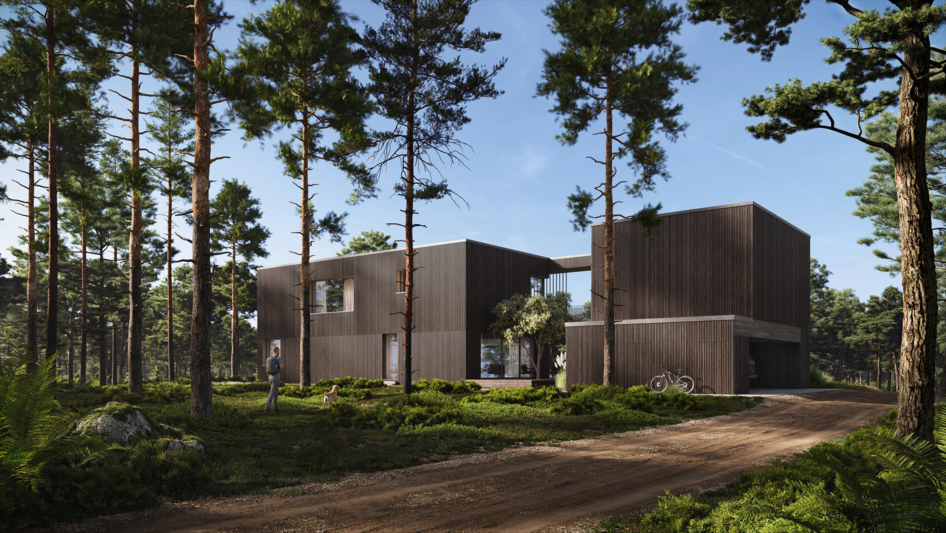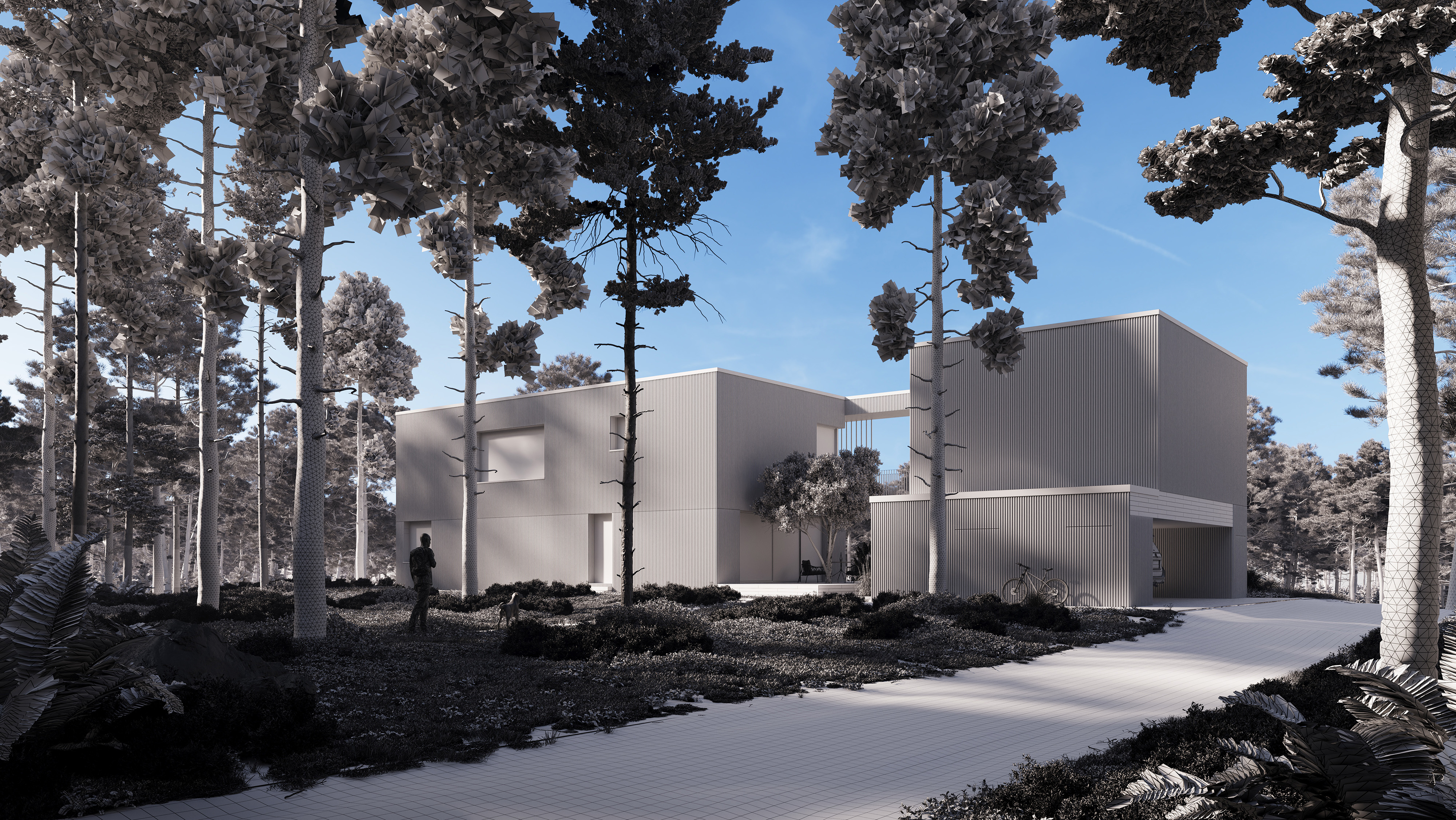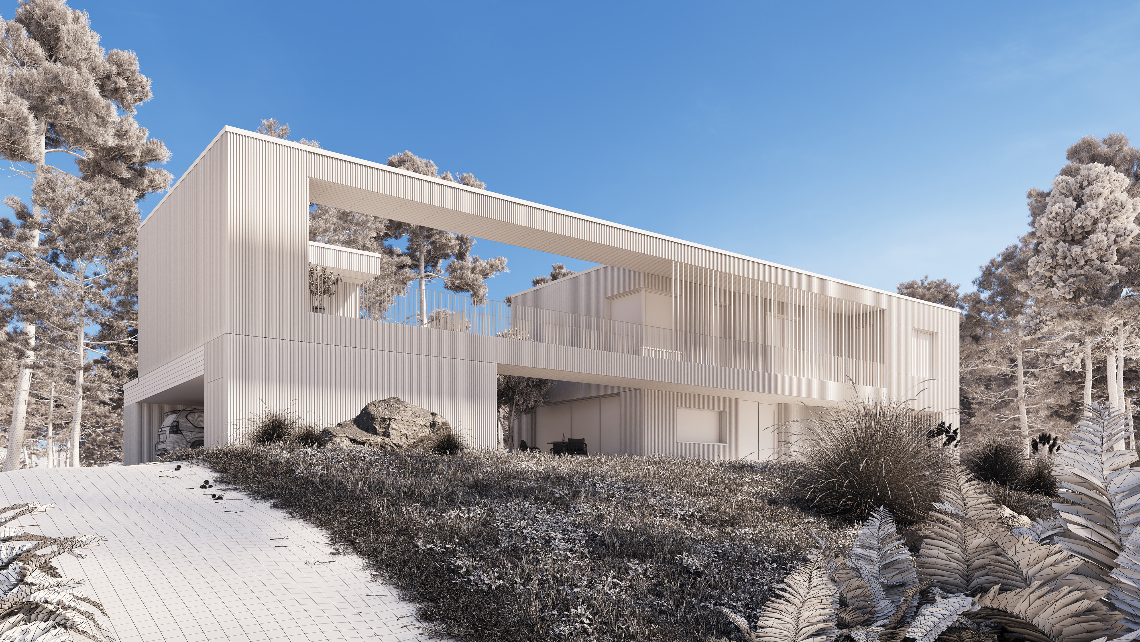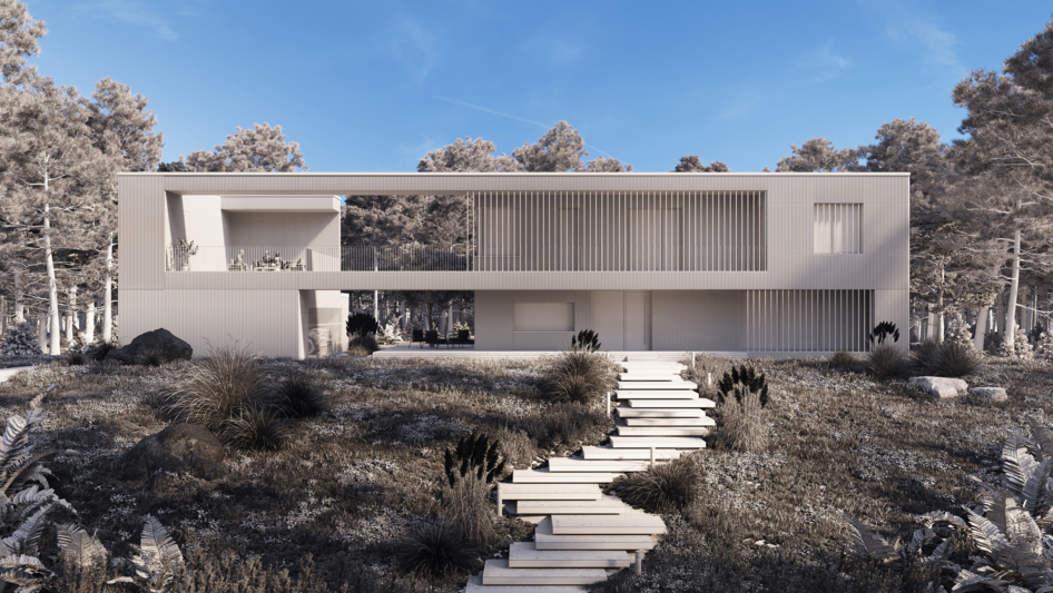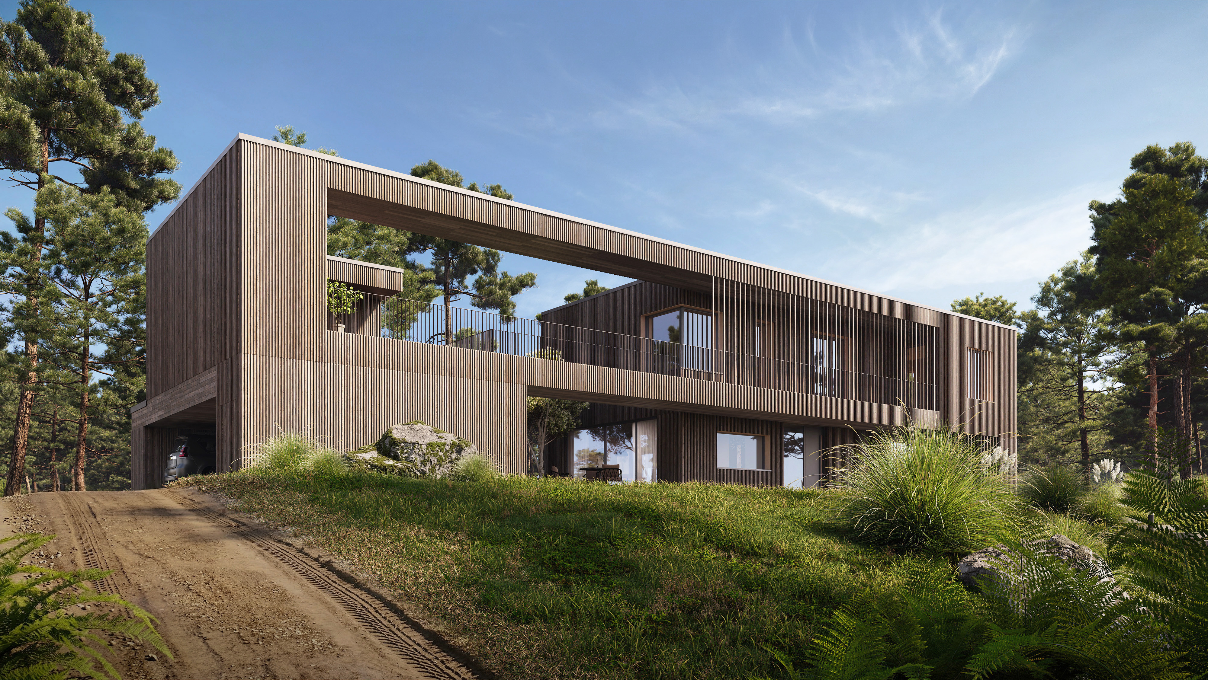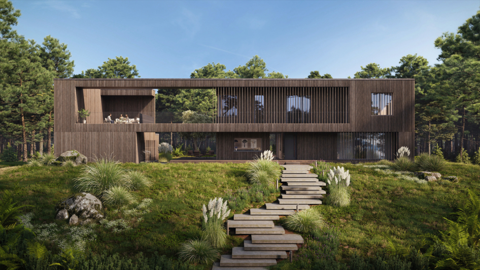 A modern timber residence carefully placed within a pine forest, designed to blur the boundary between architecture and nature. The project focuses on clean geometric volumes, warm timber cladding, and a strong connection between interior living spaces and the surrounding landscape.