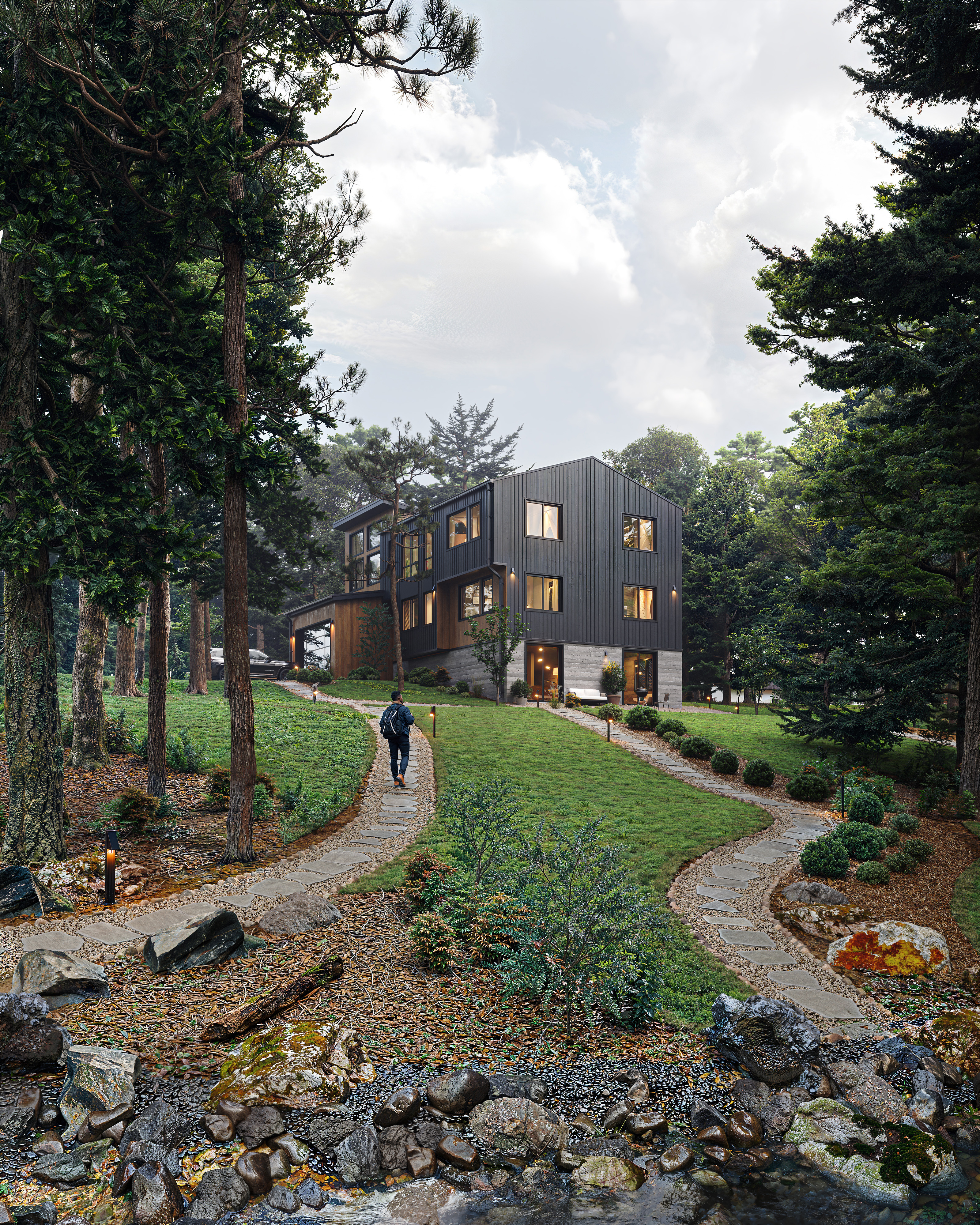 Careful landscaping preserves the site's natural moisture-loving plant life and enhances the creekside experience with curated pathways and soft, natural contours.