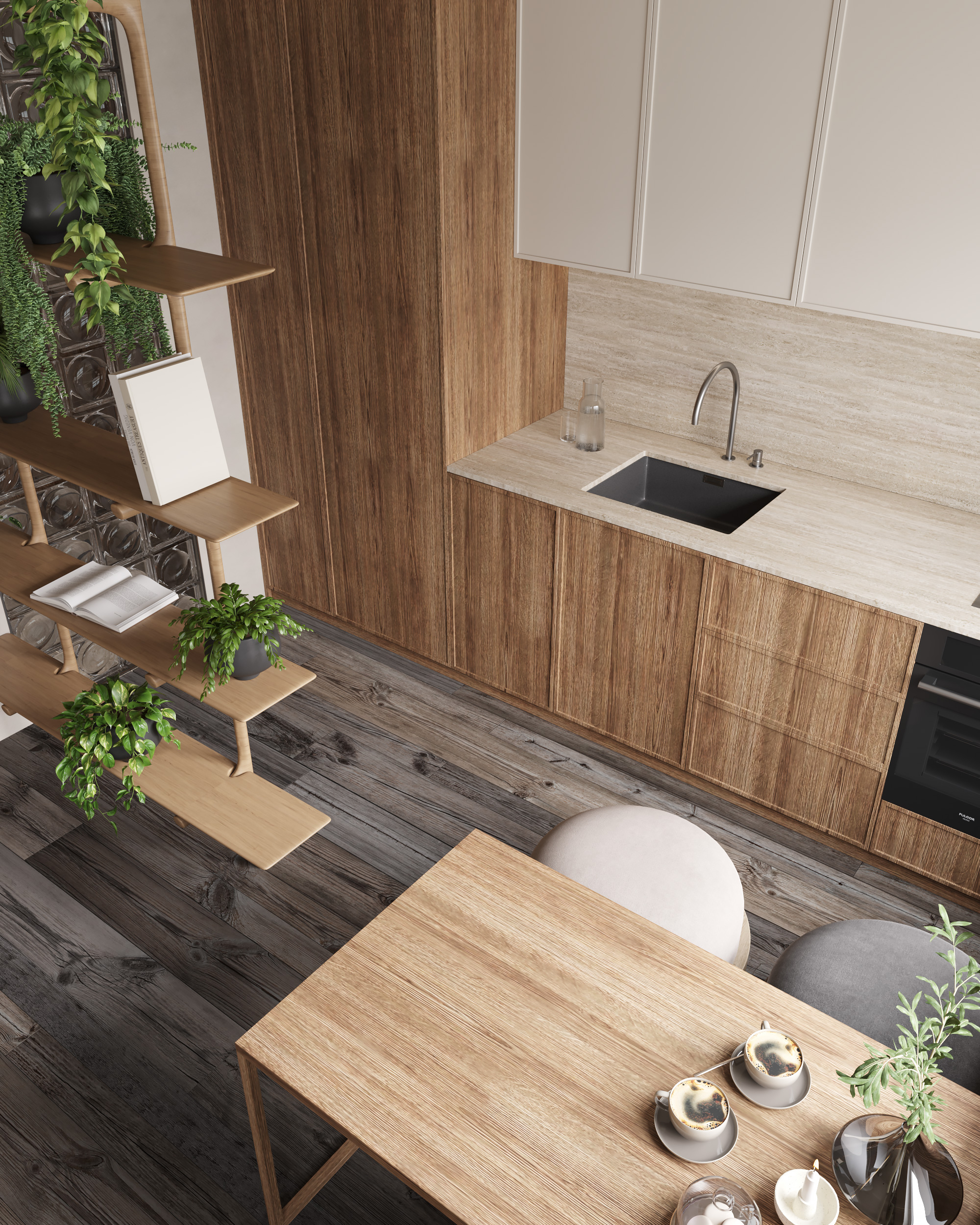 природные материалы - дерево, травертин, множество зелени, стекло и декоративный камень