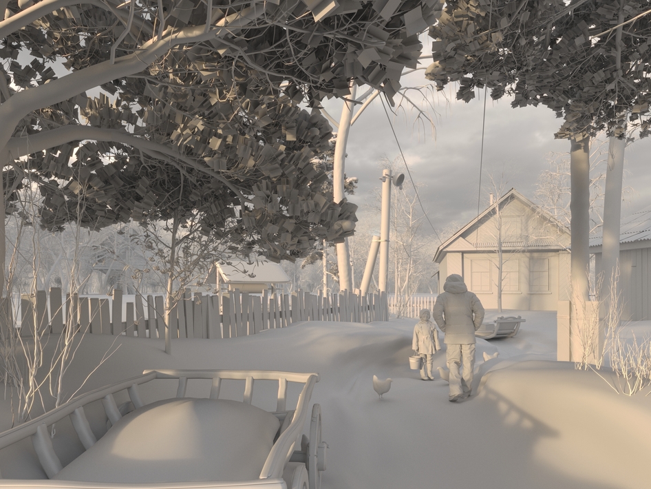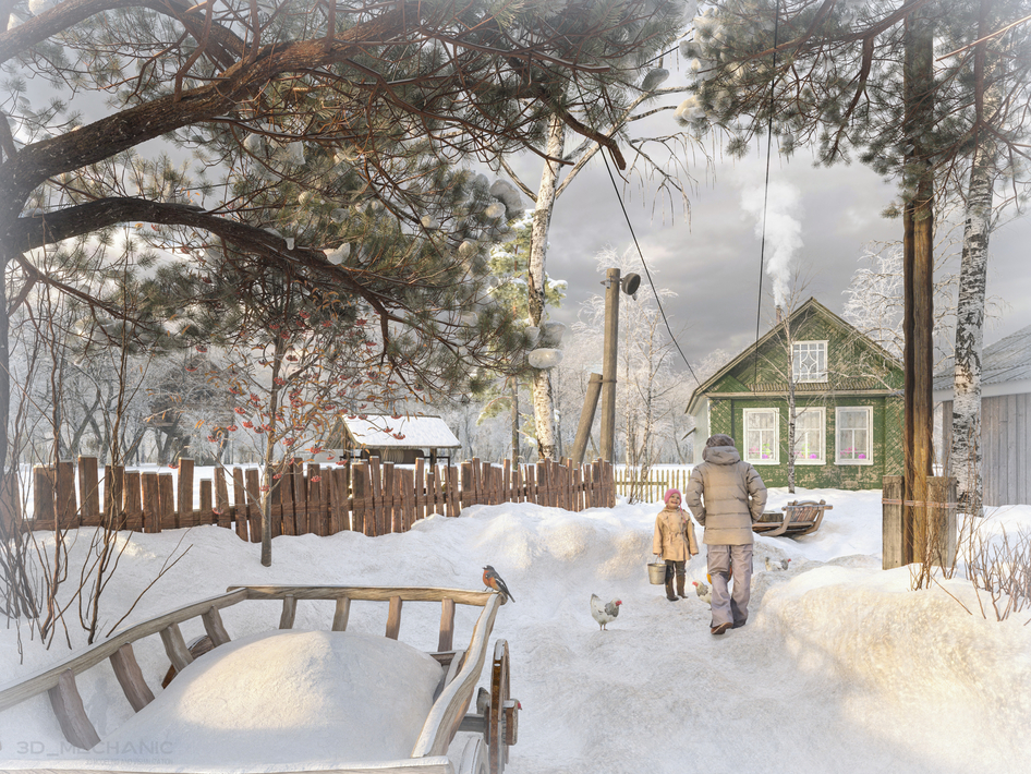 Задумка хорошая, но подача слабовата. Снегири и не снегири, в гуле посмотри картинки, забор слева странный и текстуринг у него странный. Столб слева на проезжей части, тоже странный и справа столб волнистый - береза рядом ровная, а столб волнистый, непорядок. Сани на дороге полозья угловатые, как будто полигоны экономил, я таких полозьев не видел ни разу. Про снег и без меня сказали. Уже если делаешь, надо стараться выложиться по полной)). В остальном все хорошо - видно что старался. Успехов желаю.