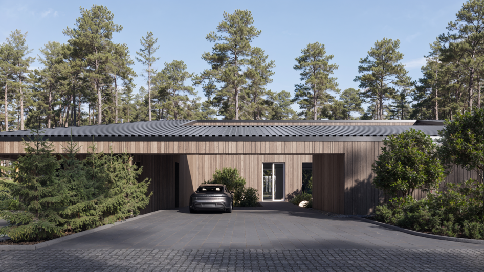 Загородный дом в скандинавском стиле, в сосновом лесу