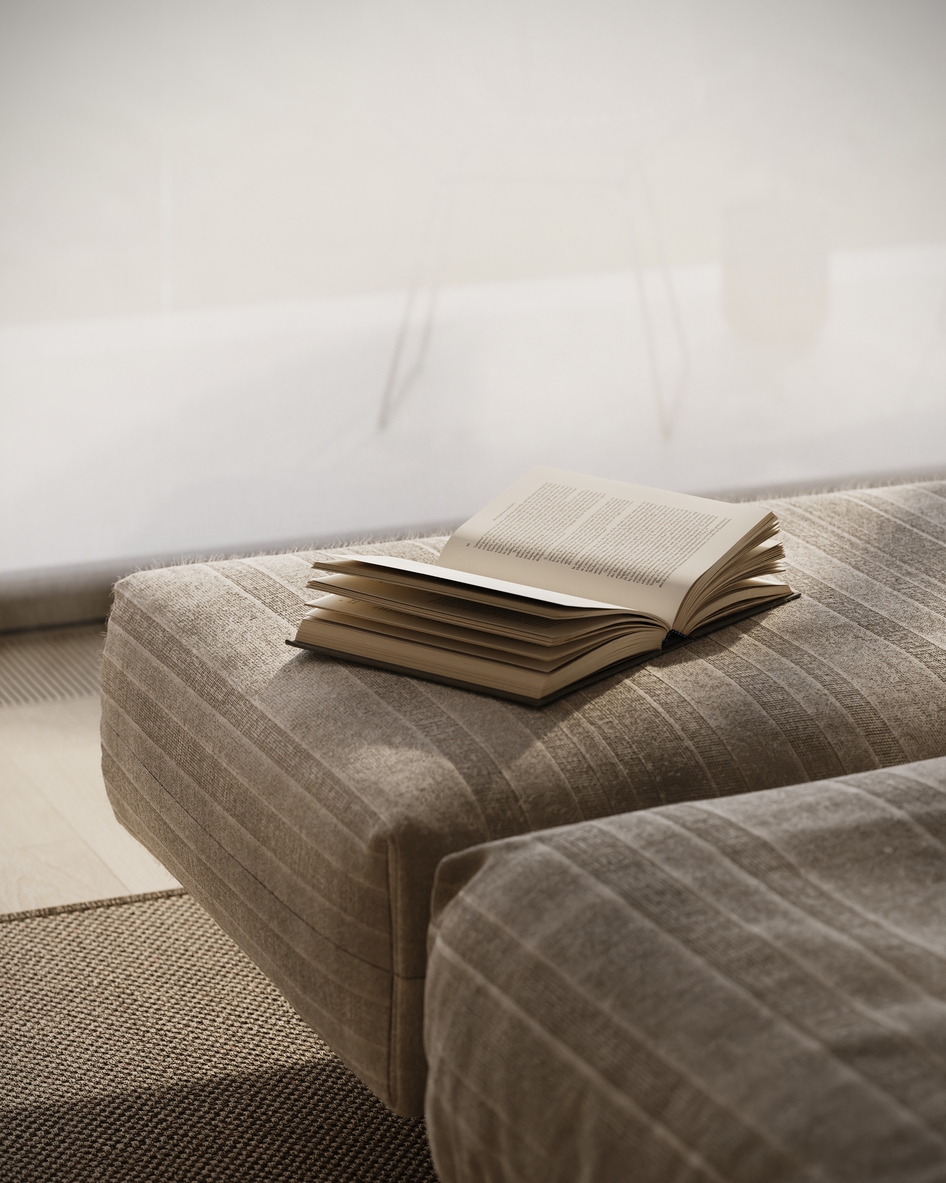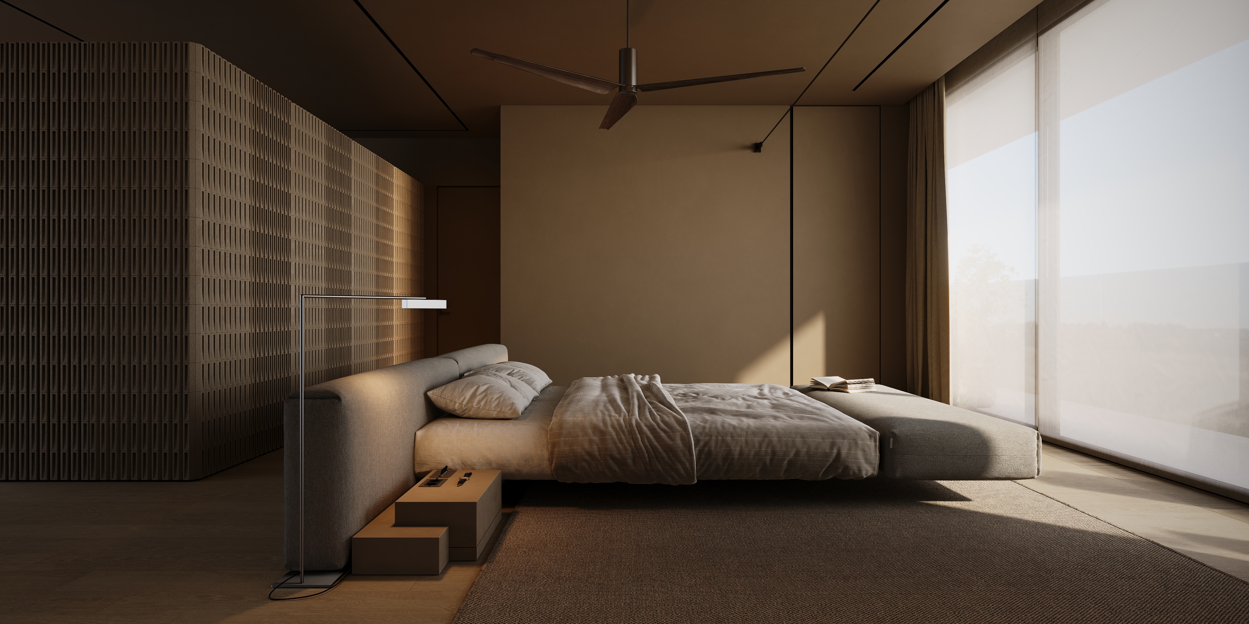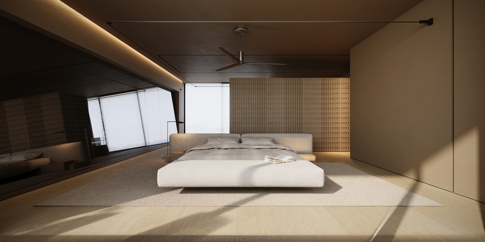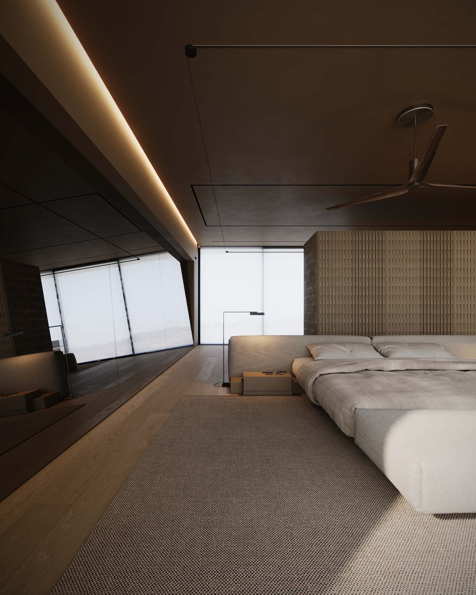 Задача была простая: сделать не светлый и не тёмный интерьер, без использования дерева и направленного технического освещения.