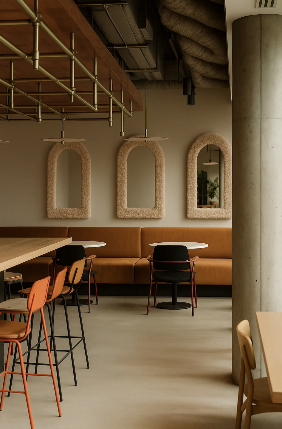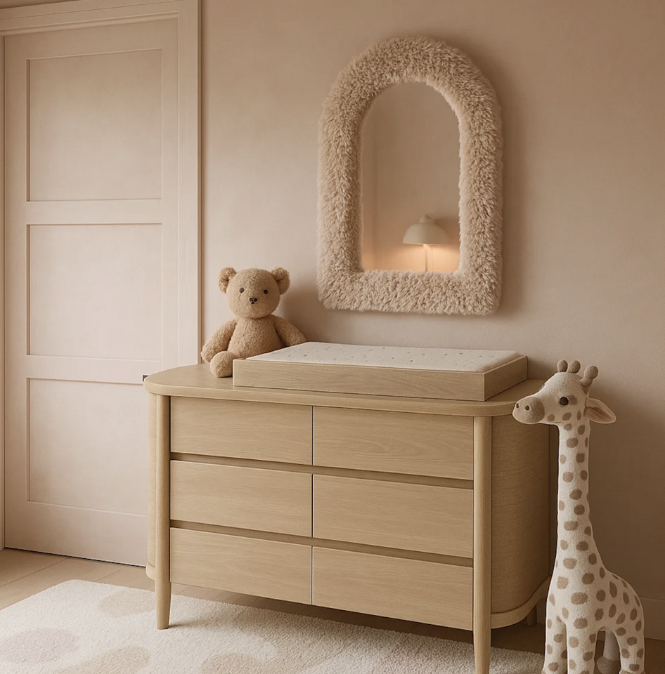 Зеркало Арка выполнено из березовой фанеры и пушистого меха овчины, отлично вписывается в интерьер детской комнаты, а также для ресторана/отеля/кафе