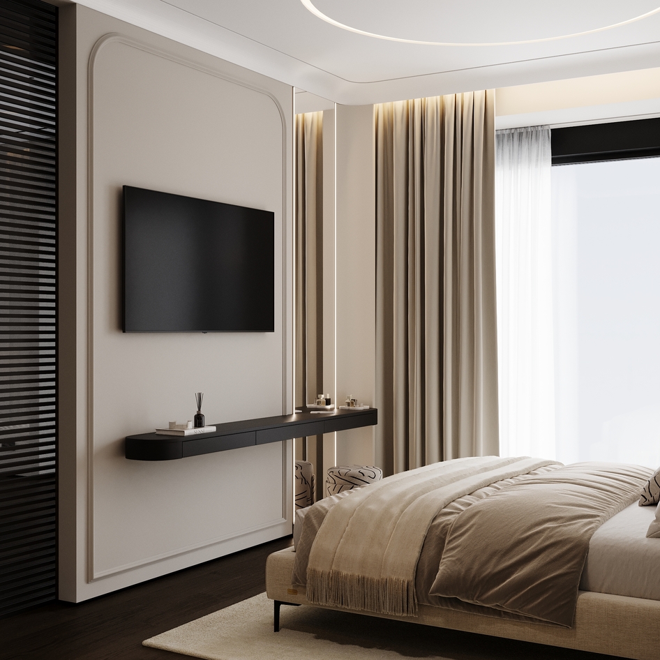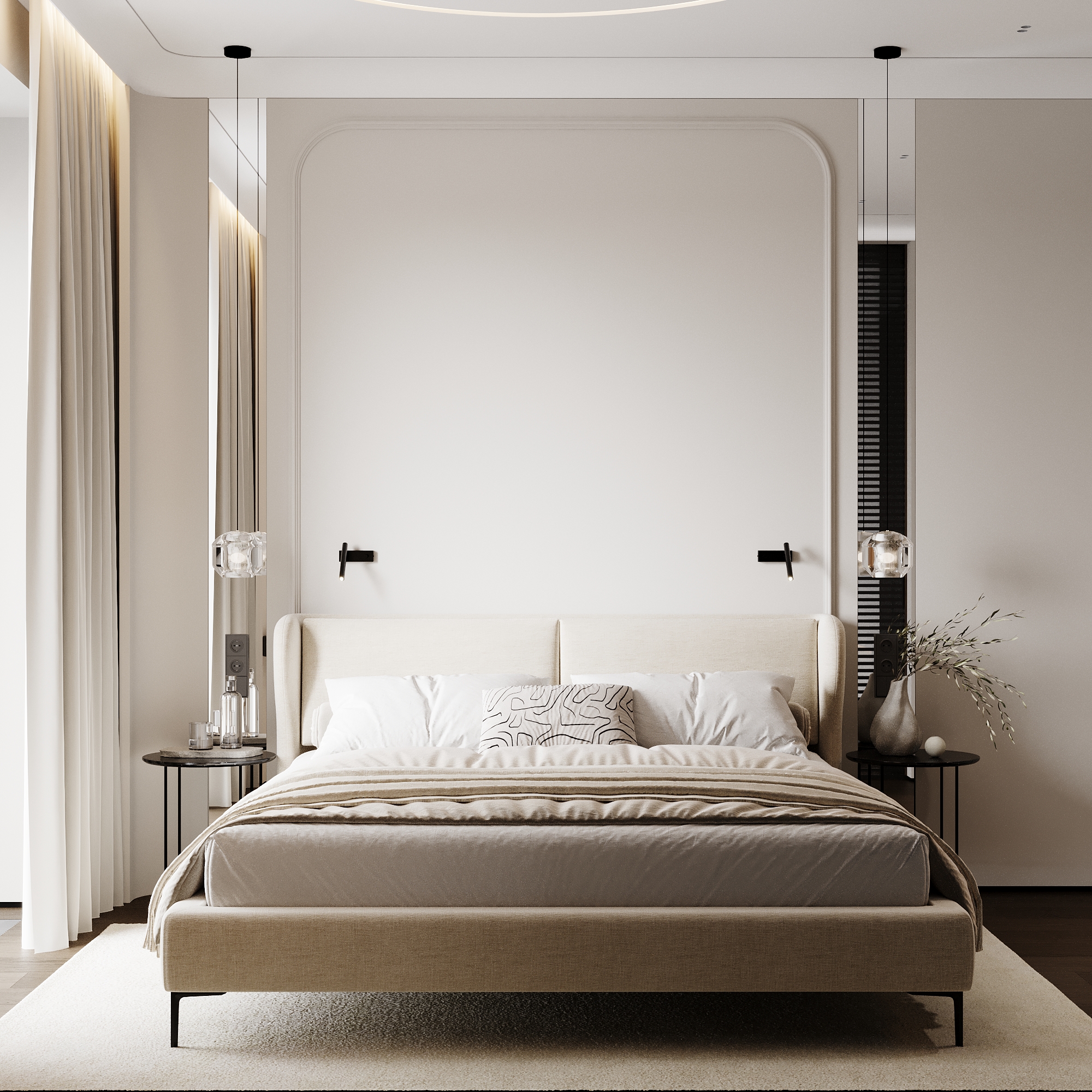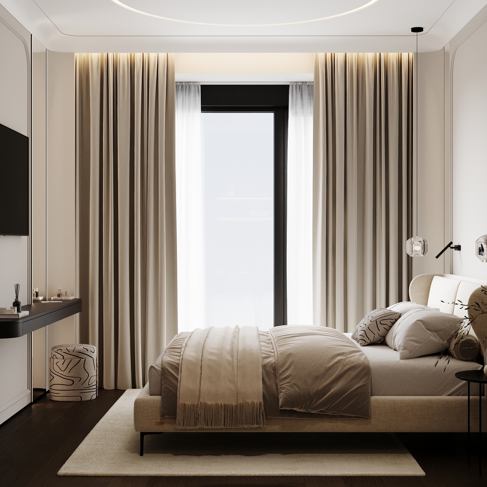 слишком зашарплено, много фликов. Попробуйте в дисплейс настройках уменьшить значение для более детального рендера дисплейса, особенно видно на рефлектах ковра. На постельное закинуть бы турбосмут, зазоры между дверцами шкафа и потолка нужно больше. переконтрастили, черные элементы тотально черные, без отражений( бра , ручки шкафов и т.д.)