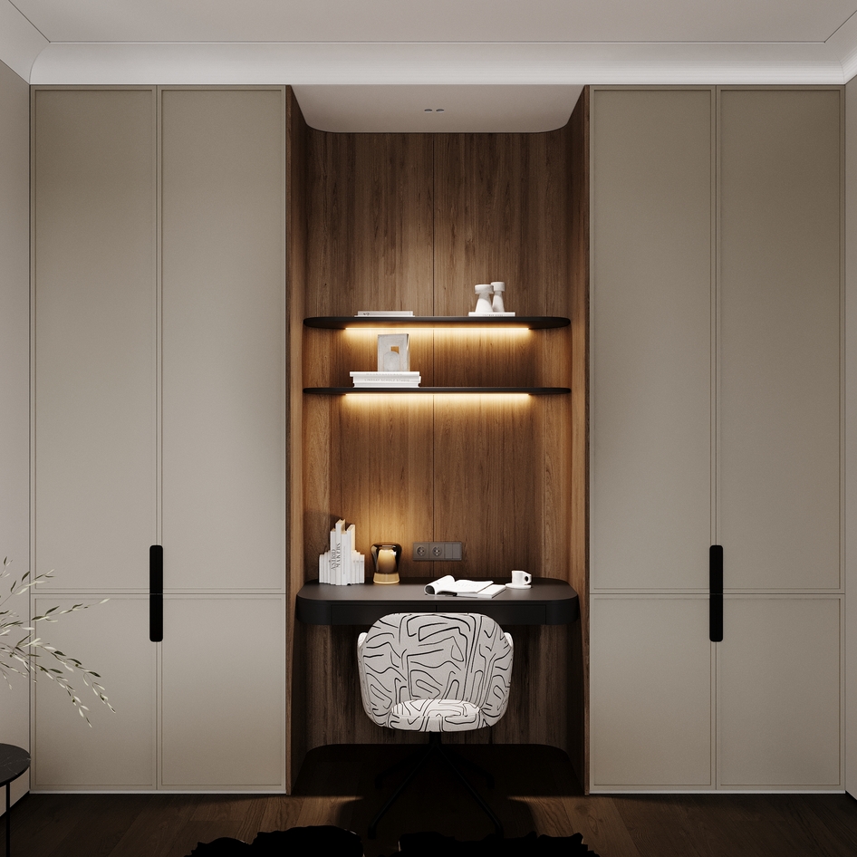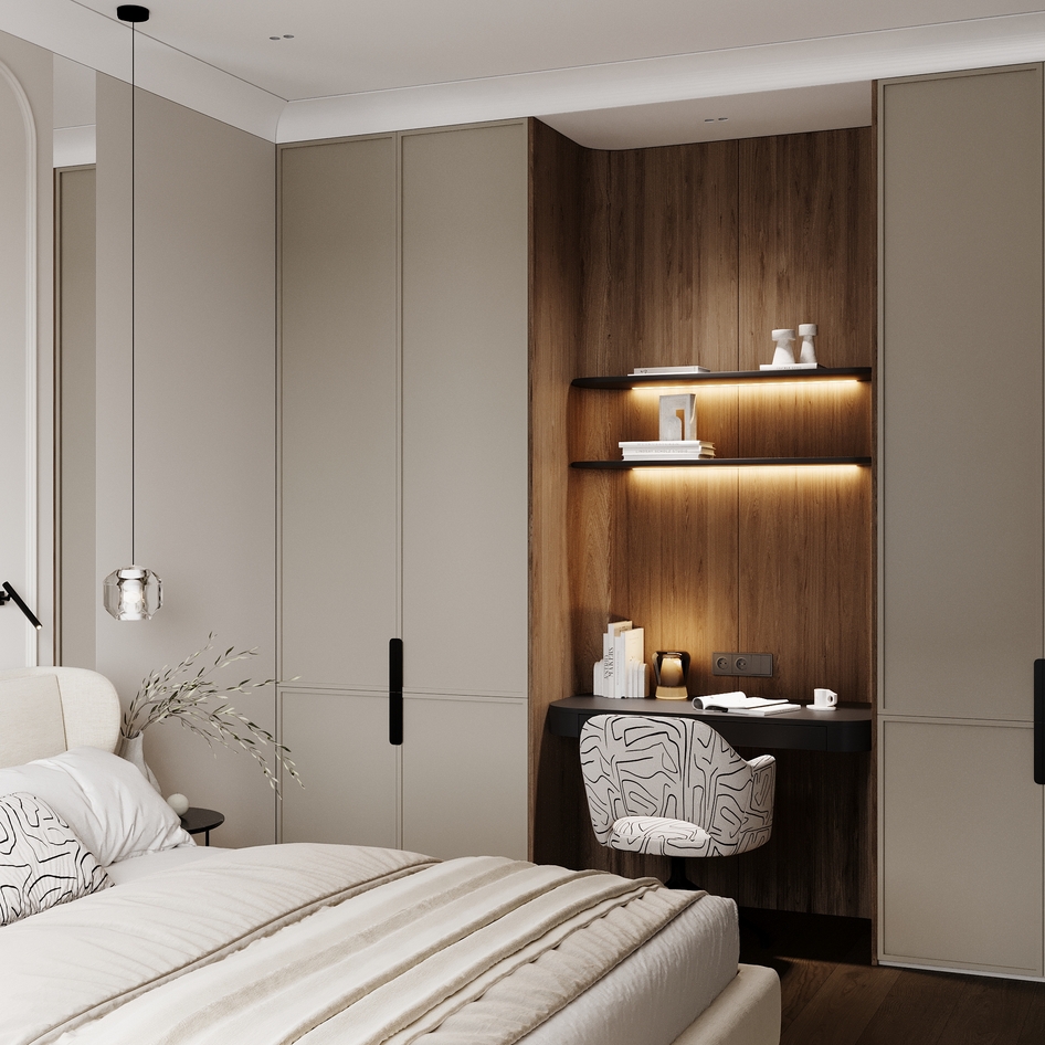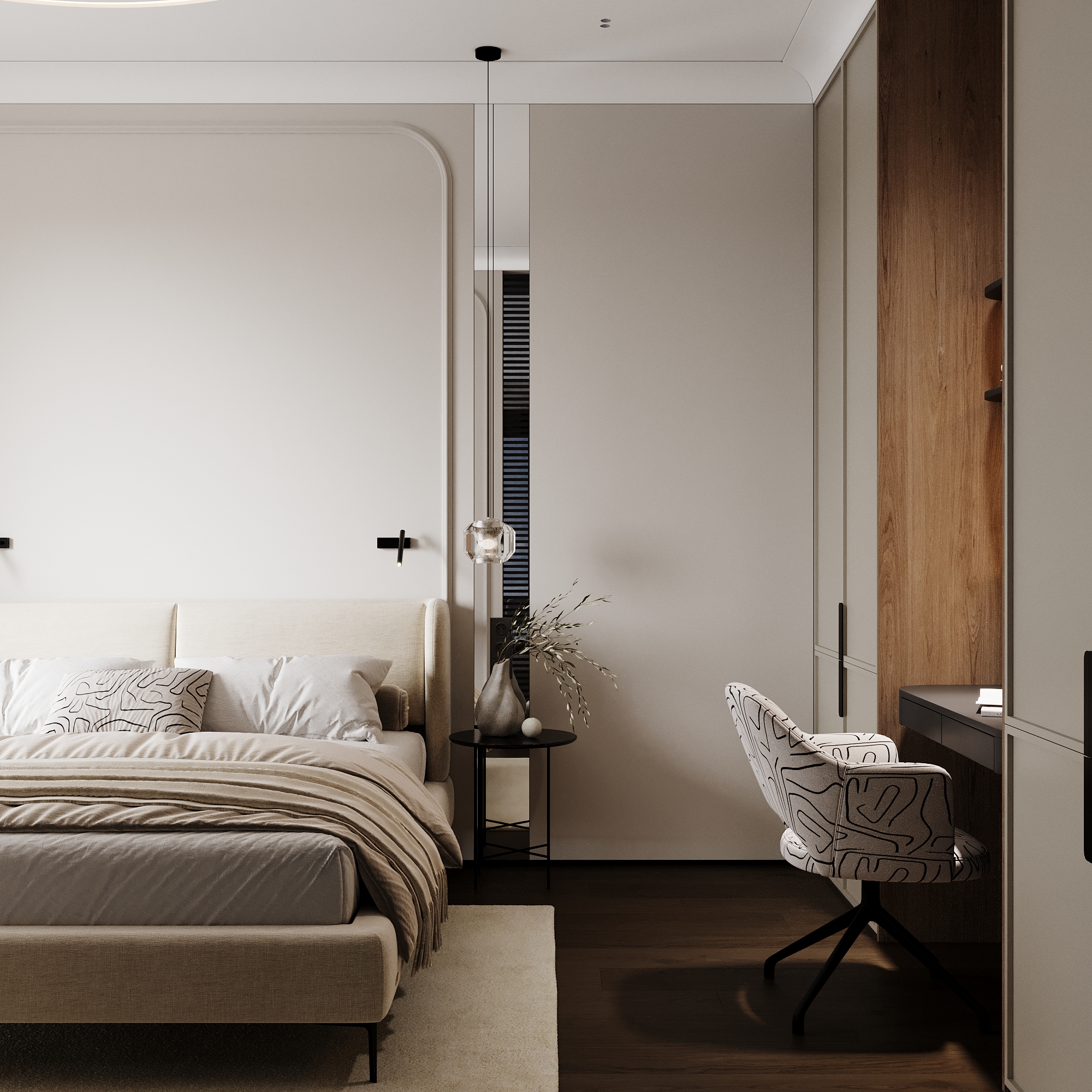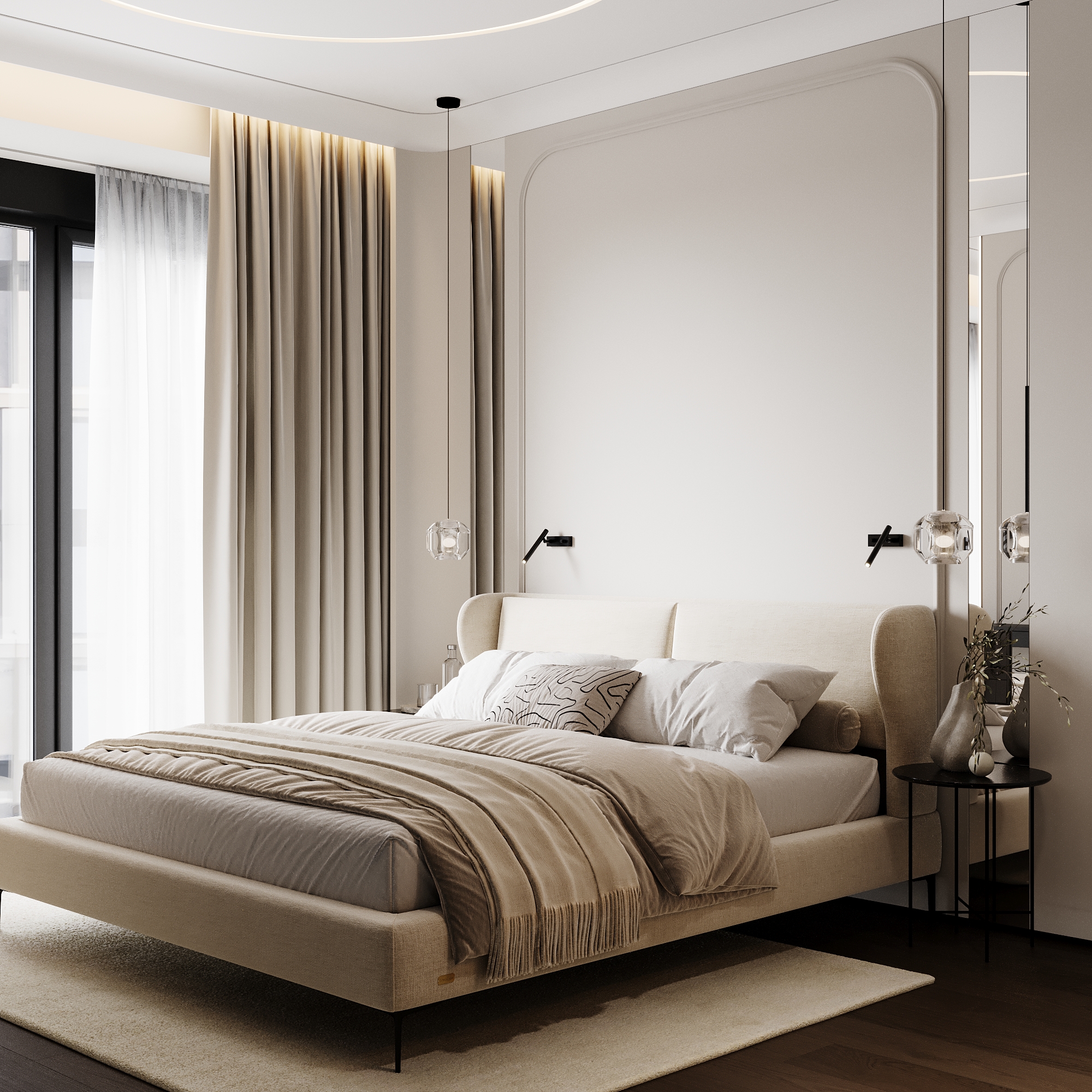 слишком зашарплено, много фликов. Попробуйте в дисплейс настройках уменьшить значение для более детального рендера дисплейса, особенно видно на рефлектах ковра. На постельное закинуть бы турбосмут, зазоры между дверцами шкафа и потолка нужно больше. переконтрастили, черные элементы тотально черные, без отражений( бра , ручки шкафов и т.д.)