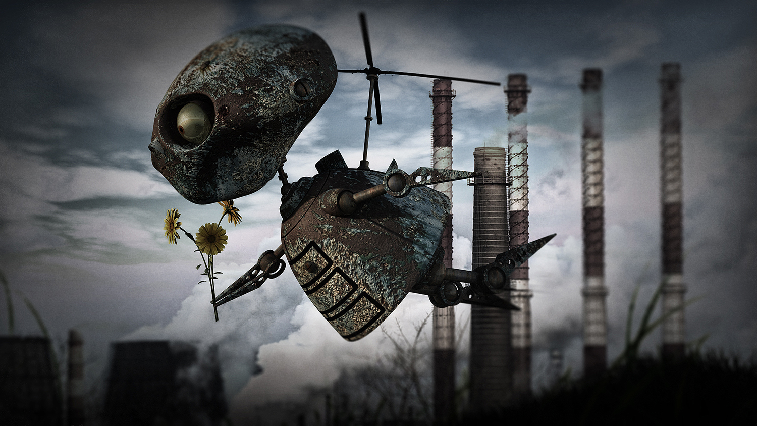 из-за бездумного фотошопного дофа не понятно где первый и второй план. Я вижу как огромнго размера робот держась рукой за трубу держит огромного размера цветы. Композиционно лучше сместить персонажа вправо, дать пространства слева добавив динамику происходящему, толково разграничить планы и дать завязку на развитие сюжета. Скажем с вашим примером неплохо должен справится жизнь пущеной ракеты с вертолёта. Передний план с установкой, шлейф направляющий взгляд зрителя на цель. Аналогично у вас можно былобы крутнуть камеру сделав её почти сзади, показать расстояние и в конце мрачным силуэтом указать мегабабу монстра с красными горящими глазщами пробивающимися через строительную пыль и смог)) Я бы сделал так.