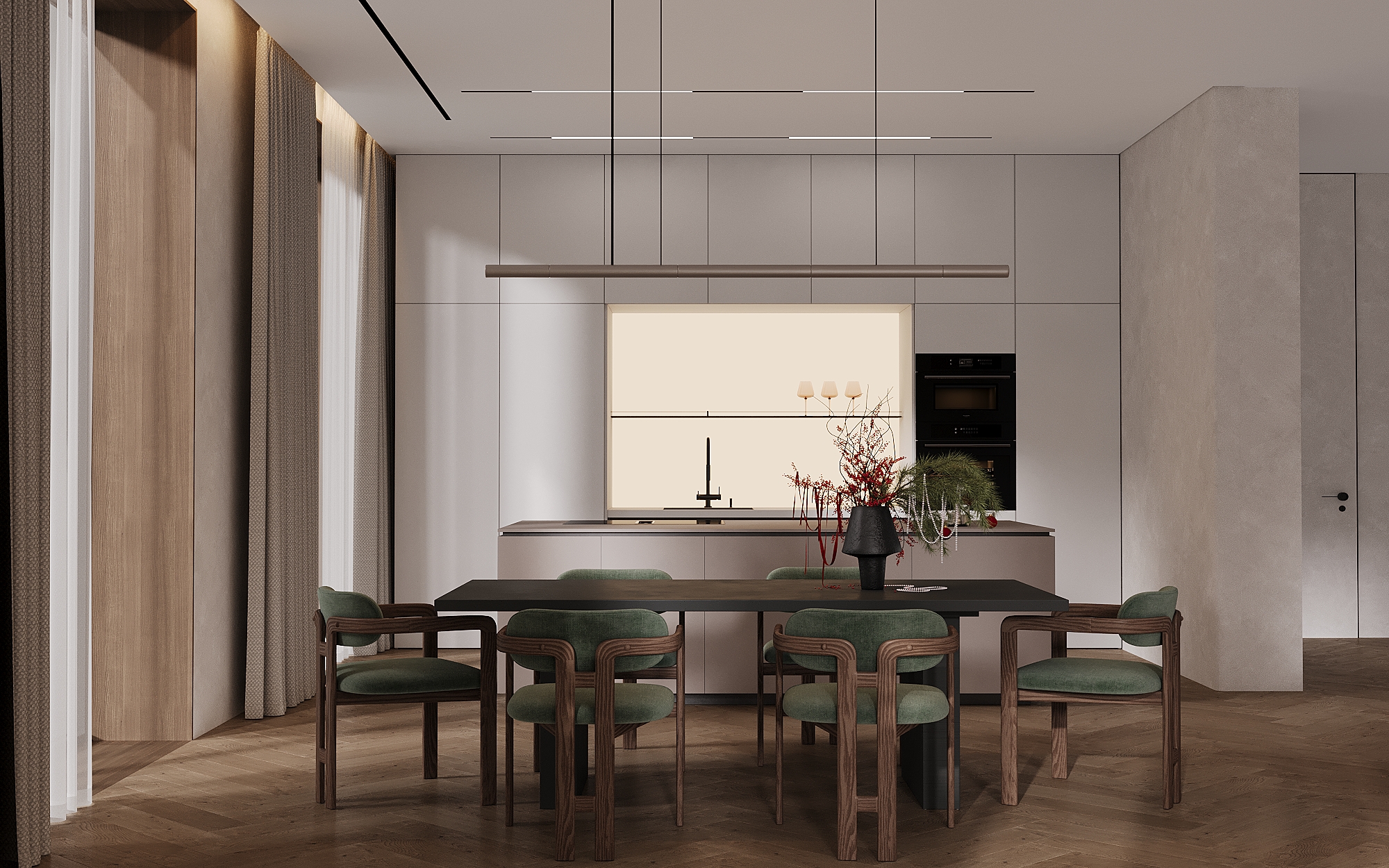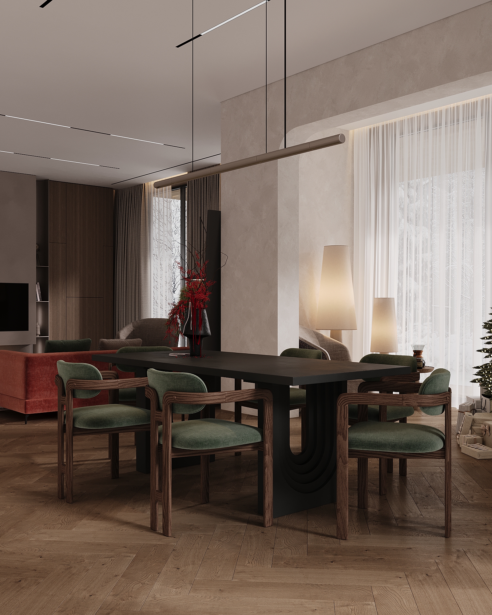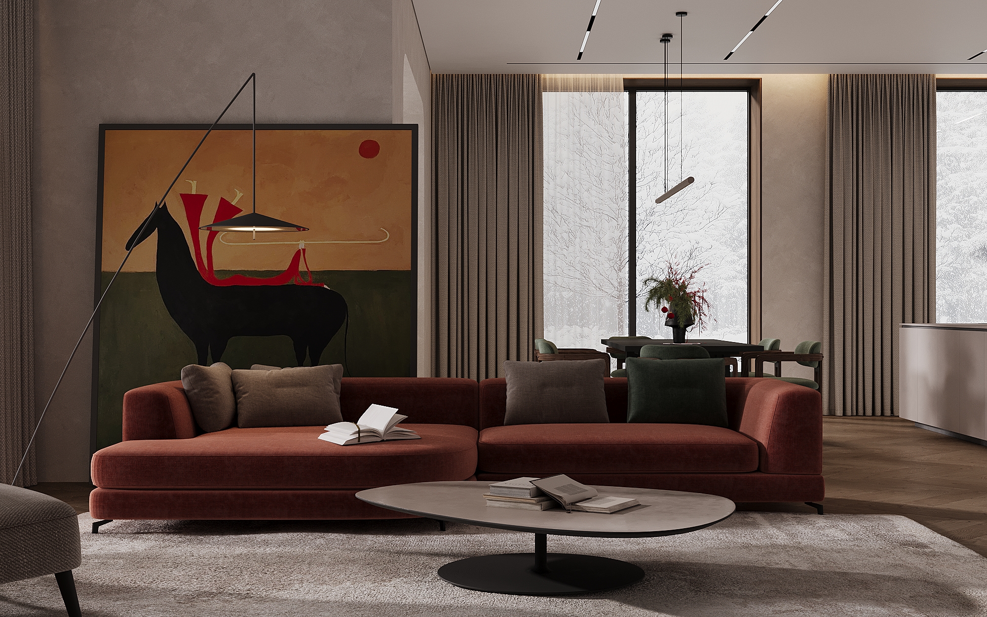 Хотелось передать ощущение уюта и тепла в зимний вечер, когда за окном идёт снег, свет мягко рассеивается в пространстве, а дом становится местом тишины и спокойствия.