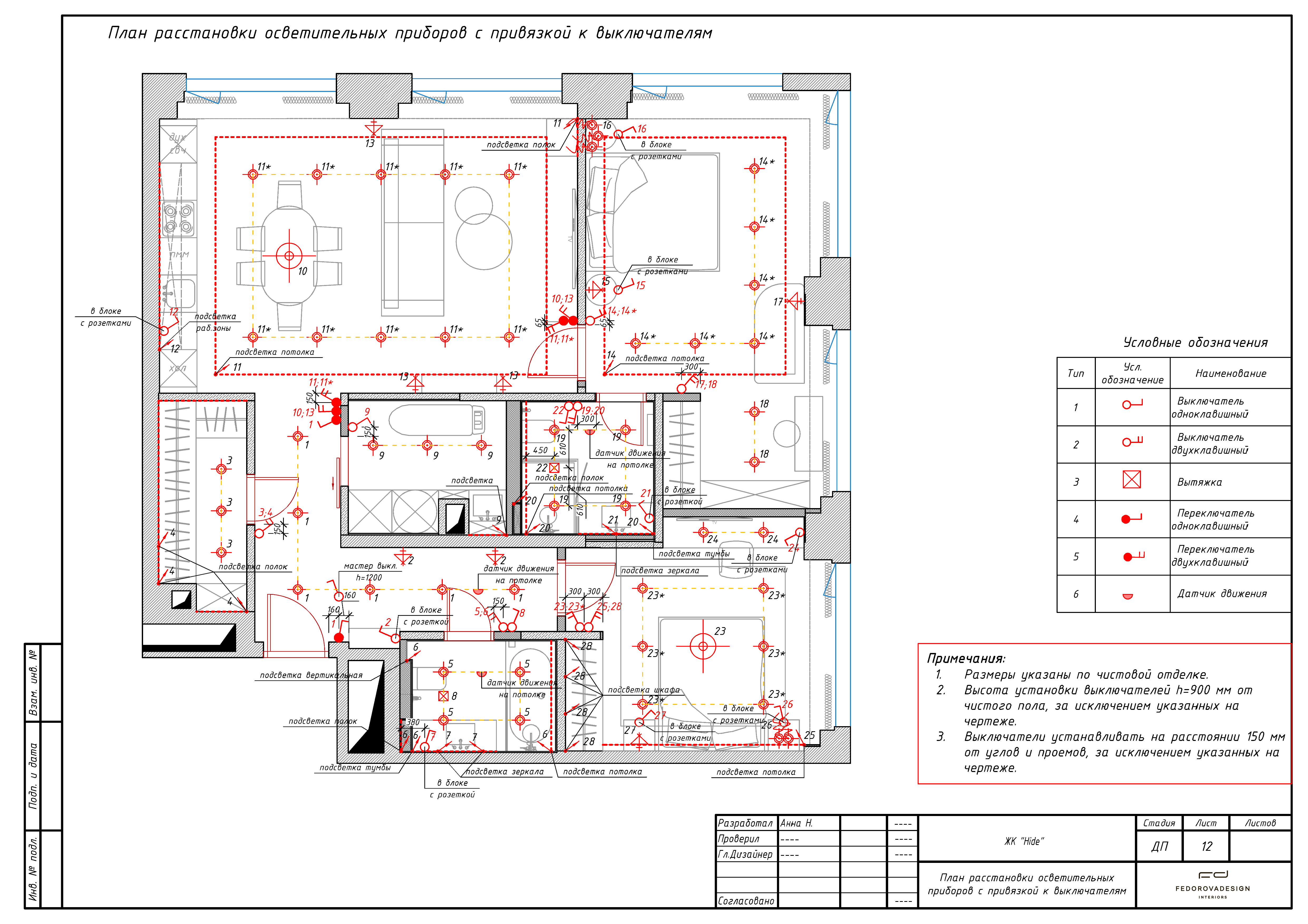 10. План расстановки осветительных приборов с привязкой к выключателям