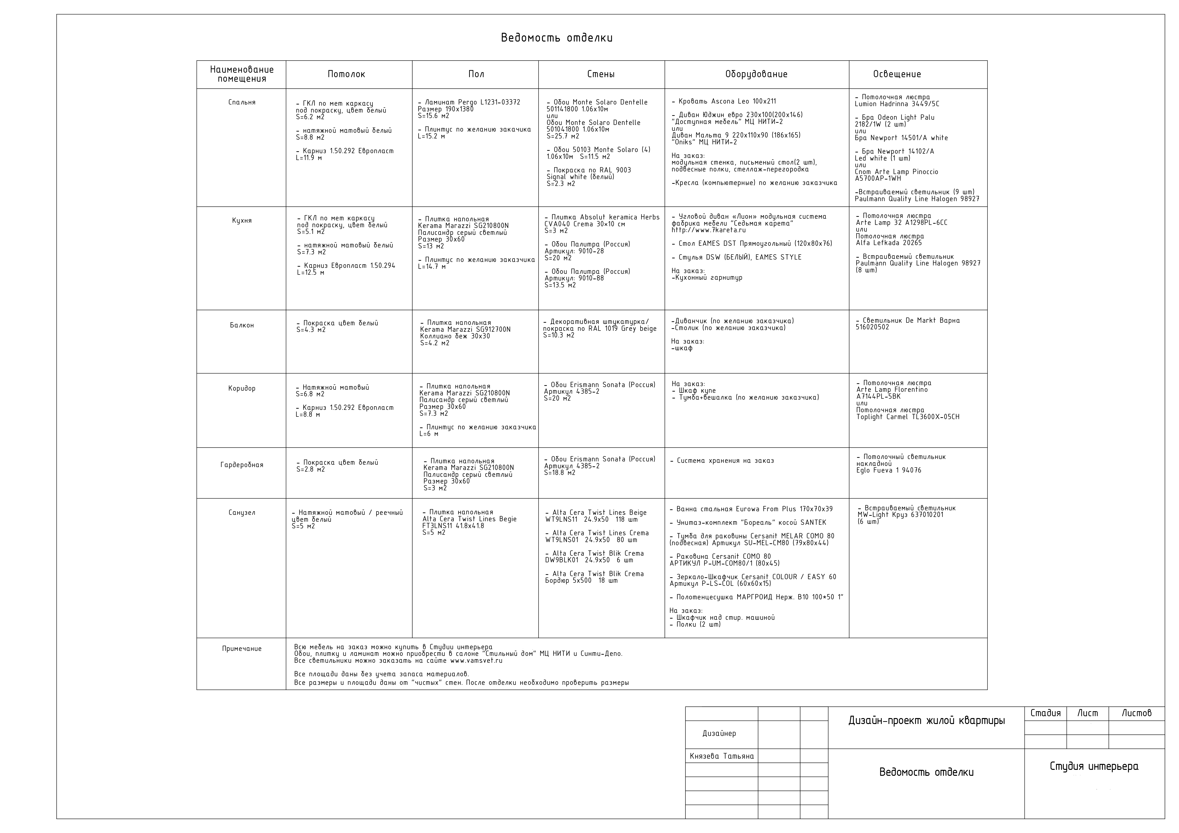 - Предложения по подбору мебели, оборудования, отделочных материалов для воплощения разработанного дизайн-проекта (ведомость отделочных материалов) *по желанию