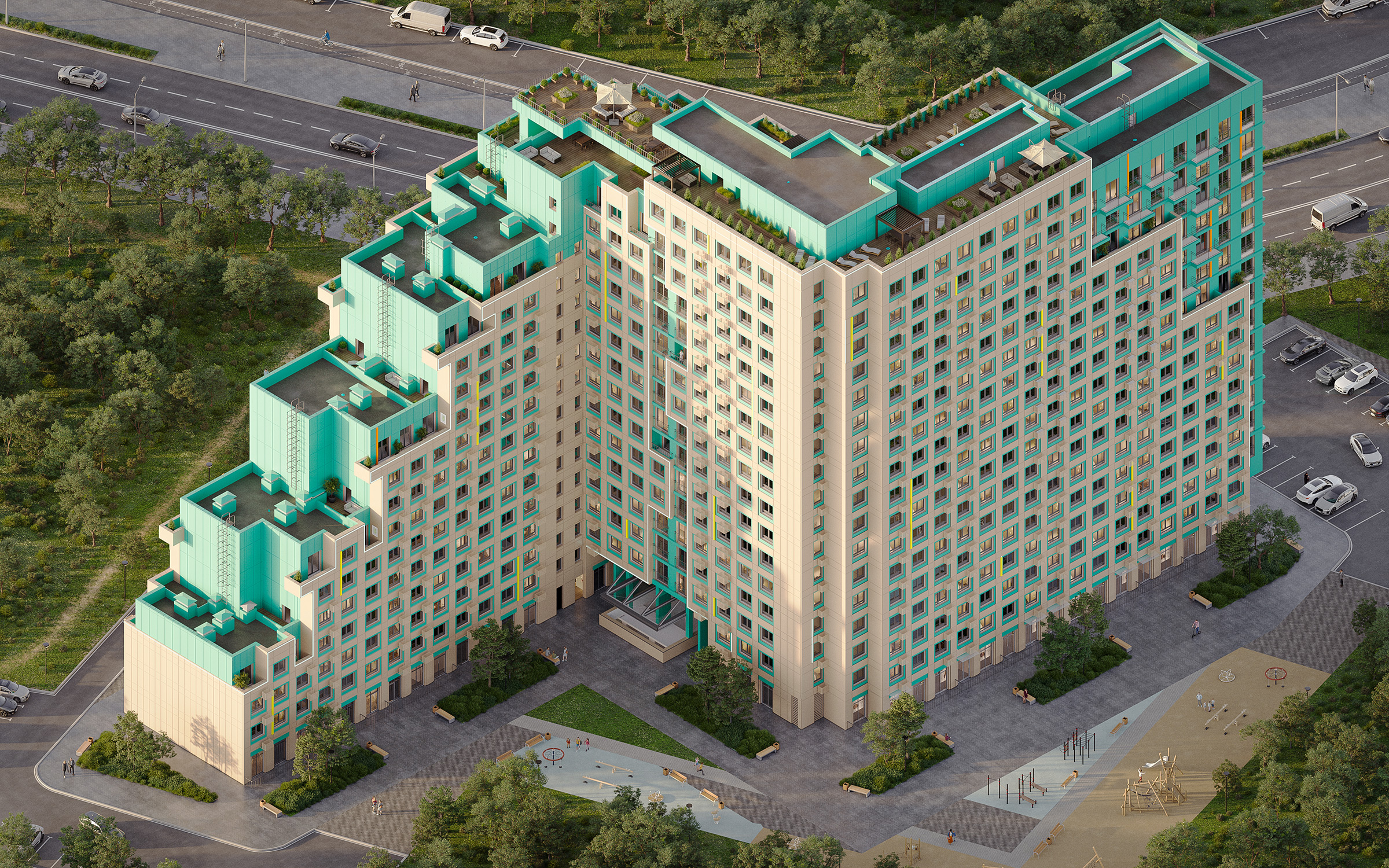 Полный цикл работ: моделирование ландшафта, благоустройства, архитектуры, озеленения, настройка материалов и освещения, постобработка в нейросетях.