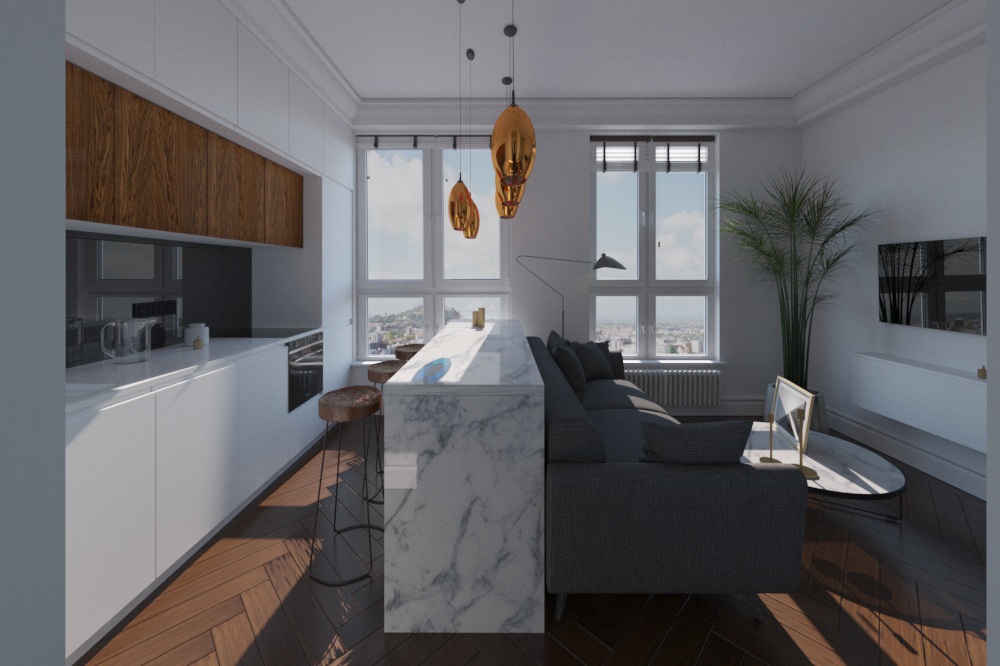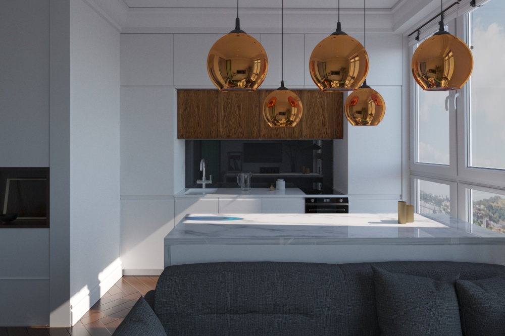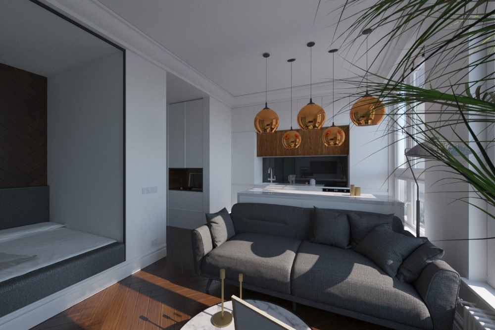 Добрый день! Меня зовут Марина. Буду рада помочь с 3D визуализацией Ваших проектов. На фото представлена визуализация квартиры 35 кв. м. (за референс взят реализованный проект квартиры от студии GEOMETRIUM)