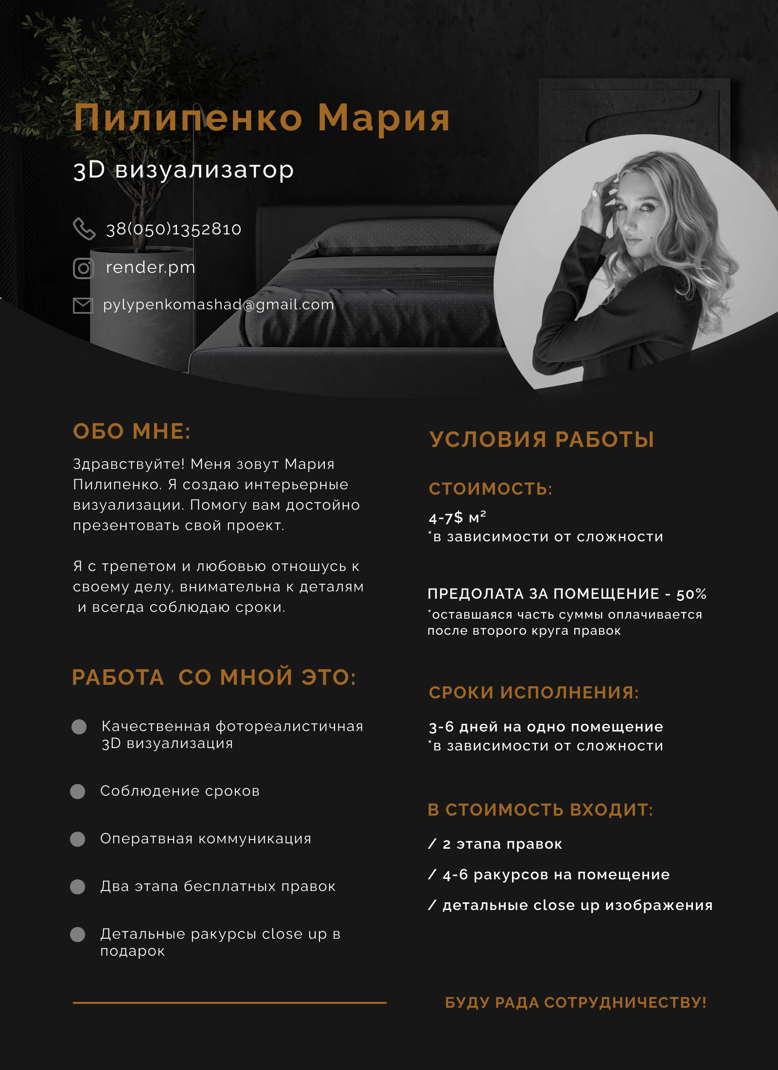 Здравствуйте! Меня зовут Пилипенко Мария. Я создаю интерьерные визуализации. Помогу вам достойно презентовать свой проект.