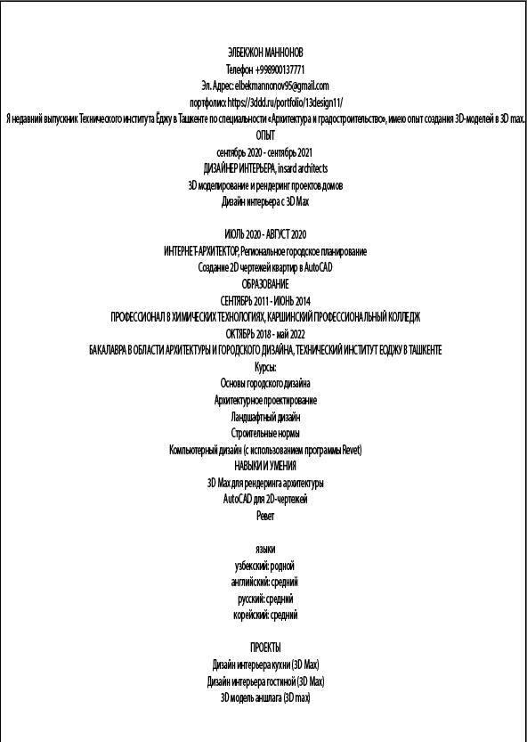 Меня зовут Элбек.Я недавний выпускник Технического института Ёджу в Ташкенте по специальности «Архитектура и градостроительство», имею опыт создания 3D-моделей в 3D max.