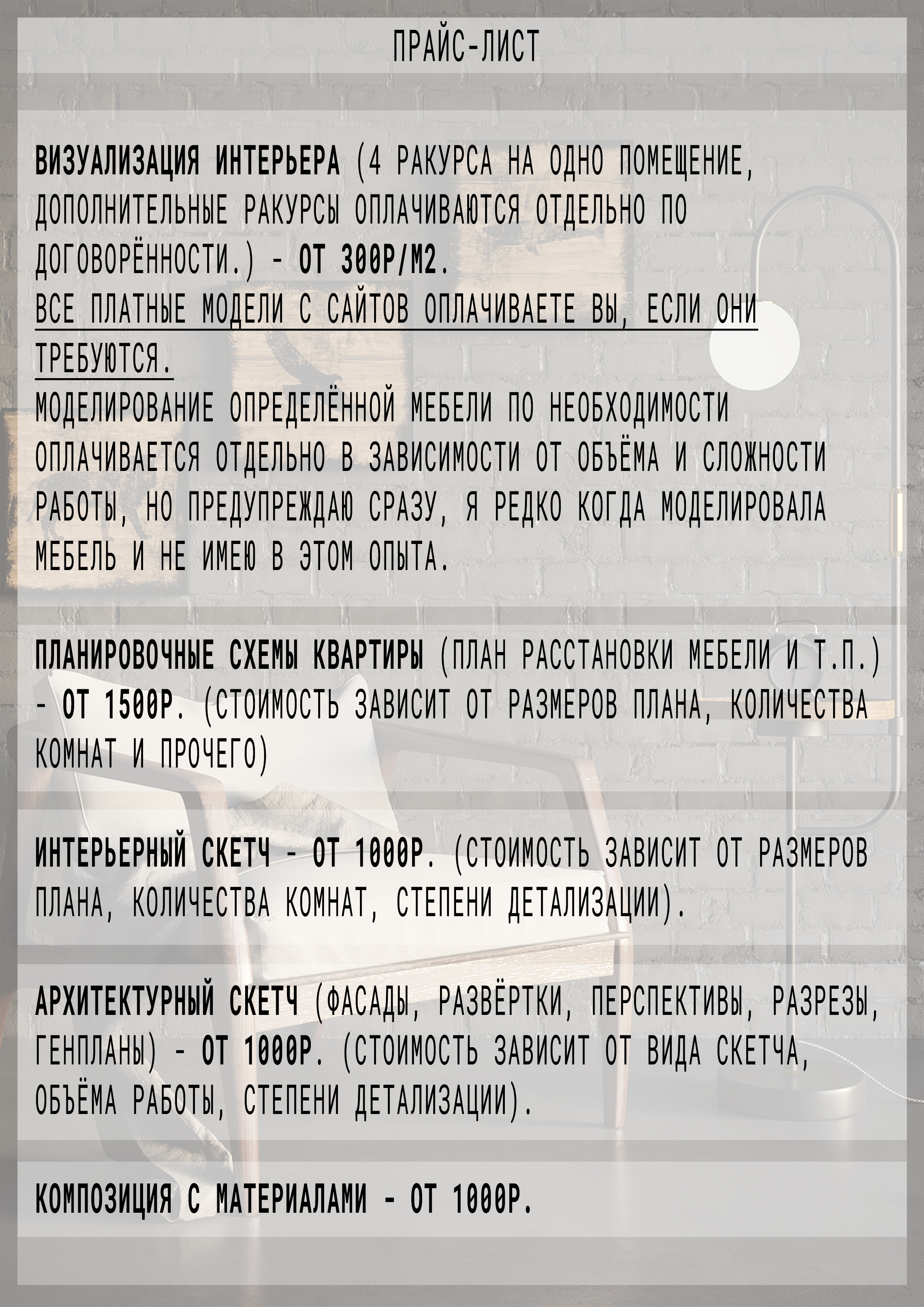 Меня зовут Кристина, я 3d визуализатор, но занимаюсь не только визуализацией, также я рисую скетчи с помощью графического планшета, имею навыки пользования программами AutoCAD, Revit и Photoshop. Я ещё только начинаю свой путь в этом деле и ищу заказы, которые по возможности смогу вложить в своё портфолио.