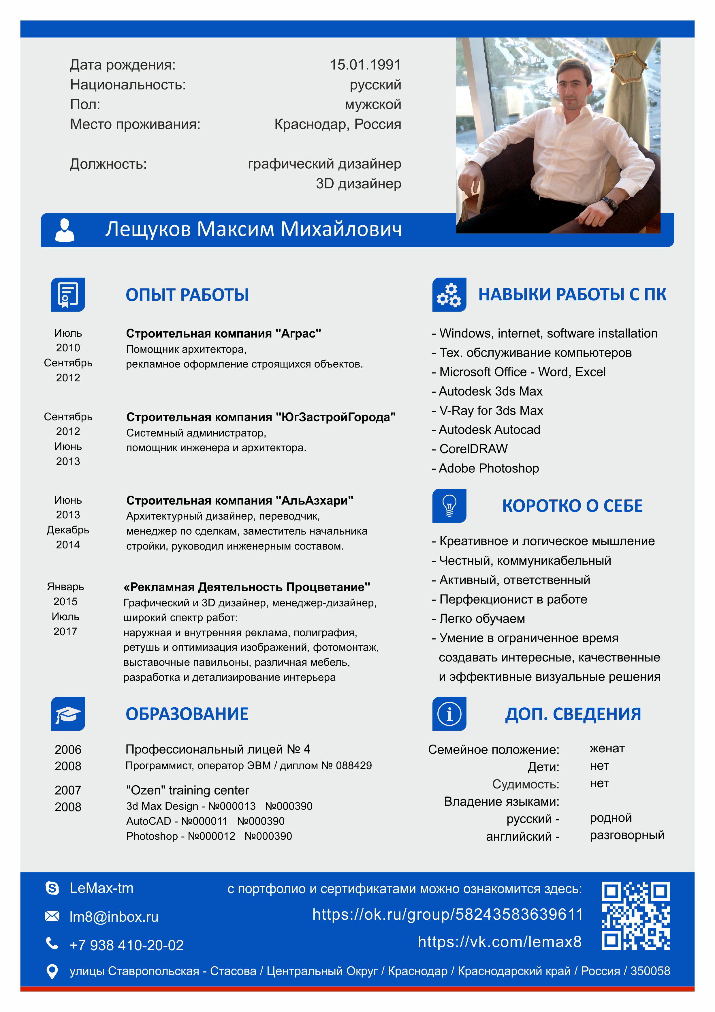 НАВЫКИ РАБОТЫ С ПК - Windows, internet, software installation - Тех. обслуживание компьютеров - Microsoft Office - Word, Excel - Autodesk 3ds Max - V-Ray for 3ds Max - Autodesk Autocad - CorelDRAW - Adobe Photoshop