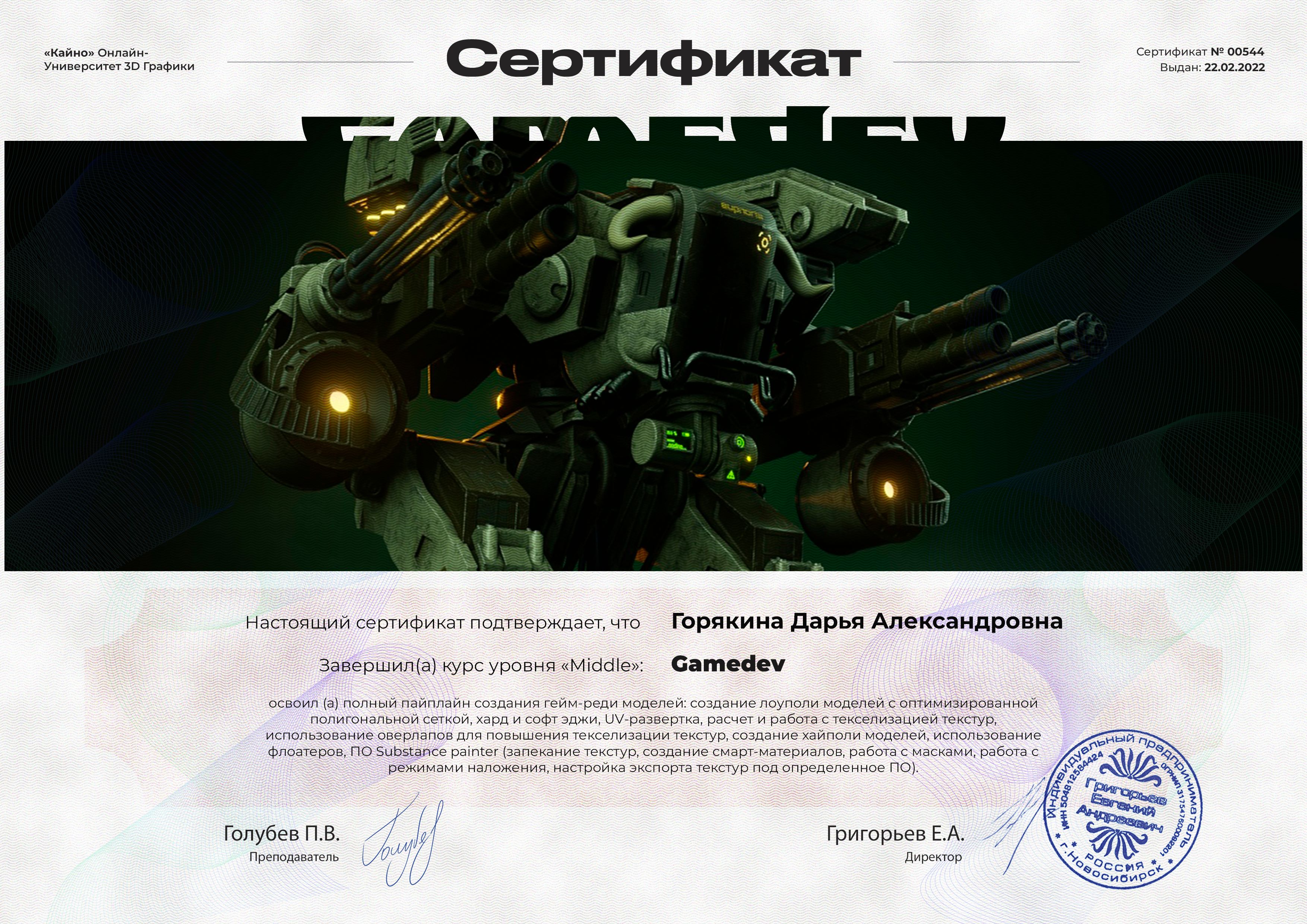 Прошла обучающие полные курсы по работе в программе blender с начального до уровня middle с 2021 по 2022гг.