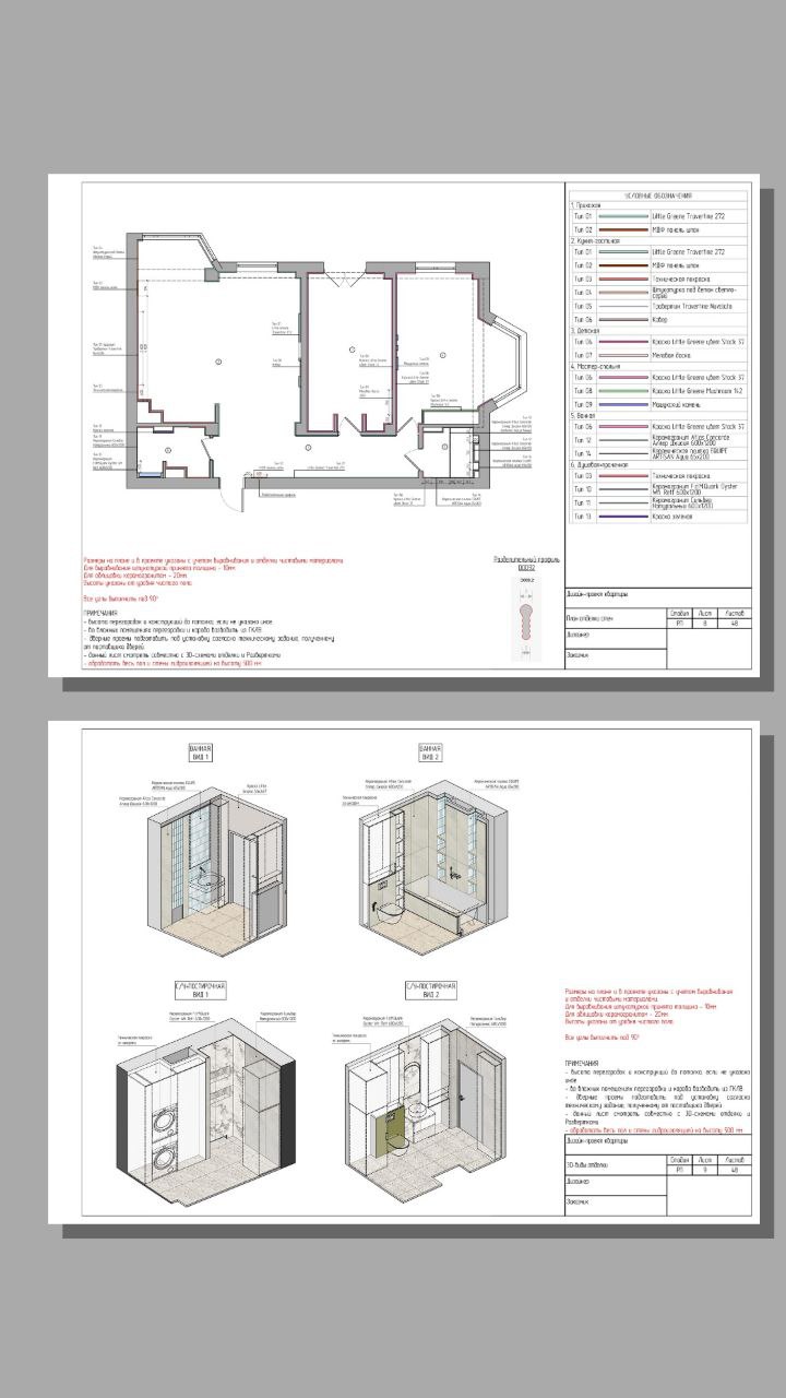 В проект входят все планы, необходимые 3D-схемы и узлы, ведомости с QR-кодами или ссылками, развертки помещений.