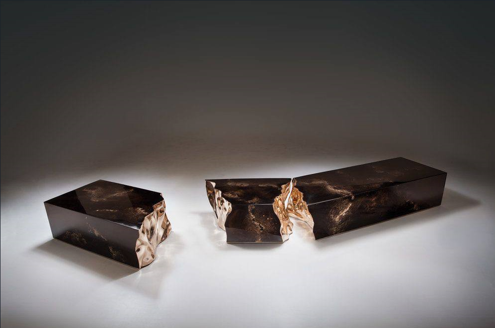 сделать кушетку со спинкой длина 1100мм,глубина 500, высота сиденья 450+высота "спинки" 150мм, как на ПЕРВОМ референсе. Камень+глазурь, по бокам торцы жидкое золото как на ВТОРОМ рефе. И еще нужен столик который как будто откололся (совпадают торцы условно как в пазле) -второй референс, размеры столика высота 450*300*300