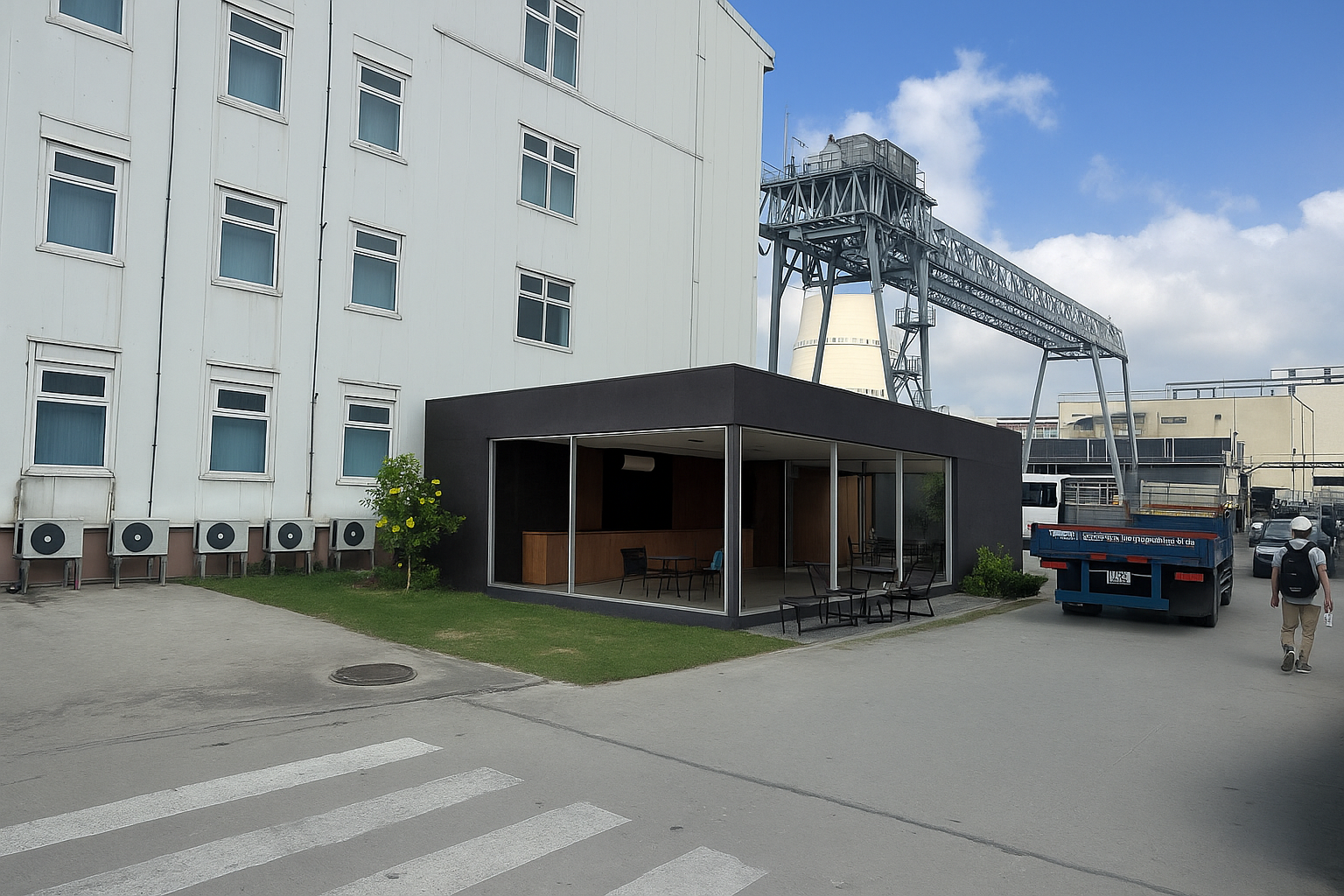 Создать 3д объект по фото и добавить его на выделенную область на фото (только там где трава), за ним должно быть пространство, только выделенный участок. Внутри стойка для бористы и дял кофе машины и пару барных столов. Цвет здания светло серый вместо черного. Это первая часть задание, предоставить проект одноэтажного здания, вторым проектом все тоже самое, но к первому этажу надо сделать второй абсолютно такой же с лестницей на второй этаж внутри в противоположной стороне от входа, но без барной стойки, добавить только столы. Все это проект кофейни, не для строительства, а для презентации. За зданием примерно метр свободного пространства, вход сделать с левой стороны, так где на фото люк. Хоть срок и указан 7 дней, но чем быстрее тем лучше, за доп вопросами обращаться в телеграмм. Есть фотография примера сделанного сеткой близкий по пониманию, но слишком широкий (нет пространства за зданием, не полностью стеклянный и сетка так же удалила дорожку, но визуально то что мы хотим.