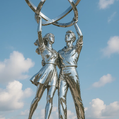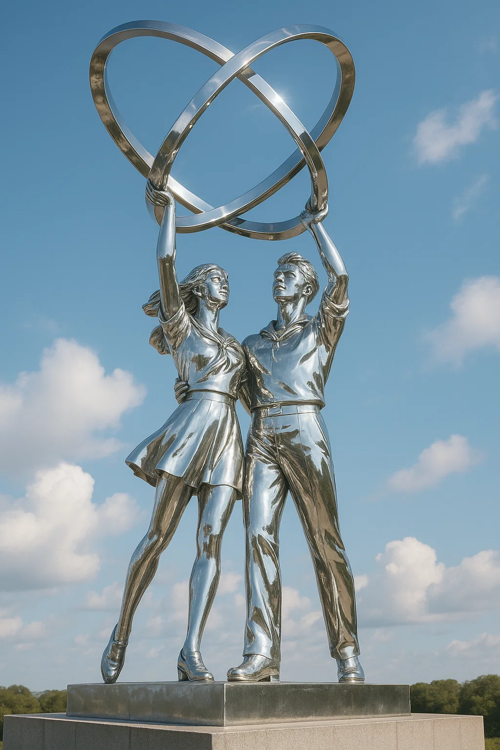 Композиция: Фигуры стоят рядом, в динамичных, но гармоничных позах. Совместно они держат над головами две непрерывные, плавно изгибающиеся ленты. Ленты должны символизировать орбиту — движение по кругу, траекторию. Они могут переплетаться, образуя единую замкнутую структуру.