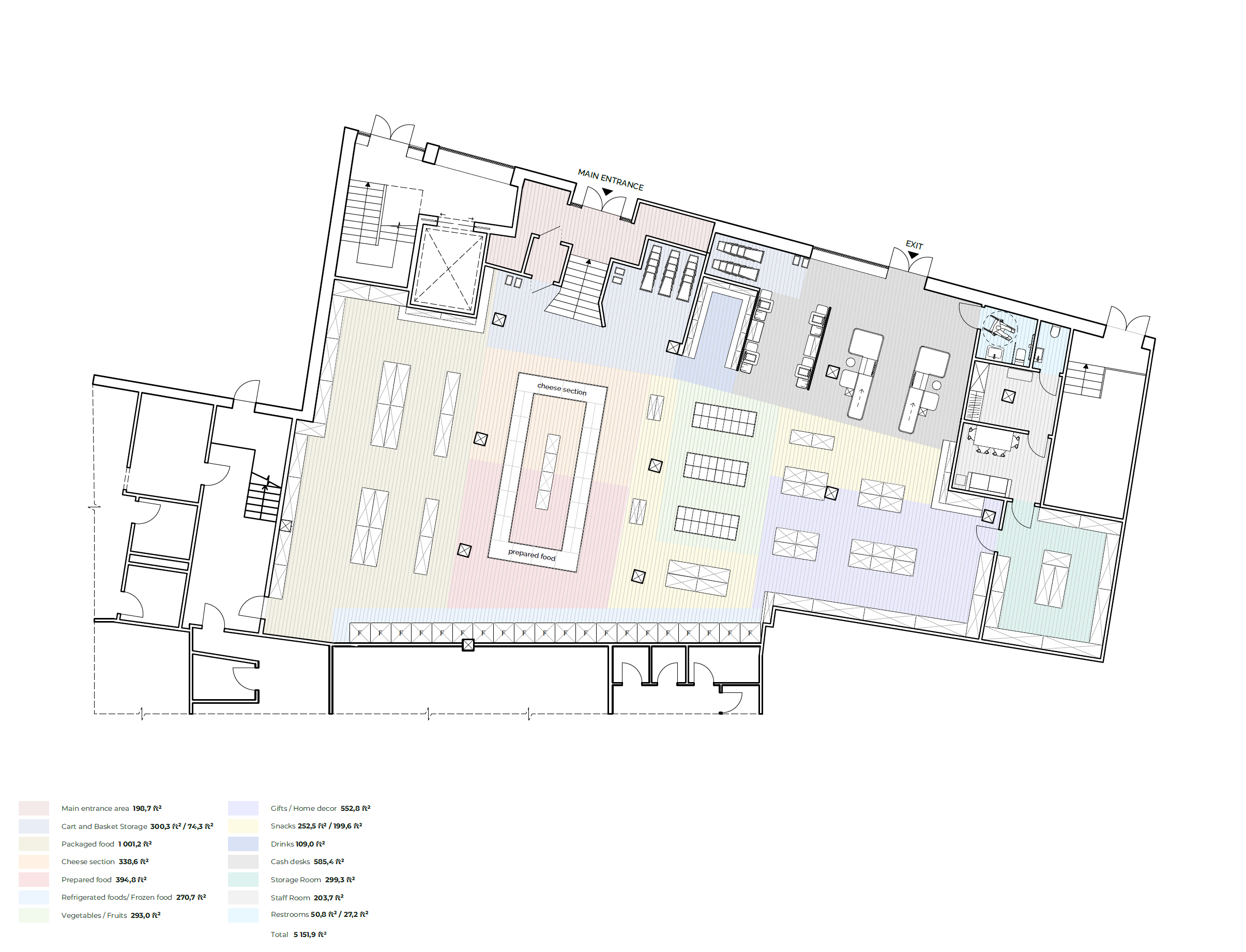 (fresh, bakery, dairy, alcohol, craft products, кассовая зона и т.д.)
