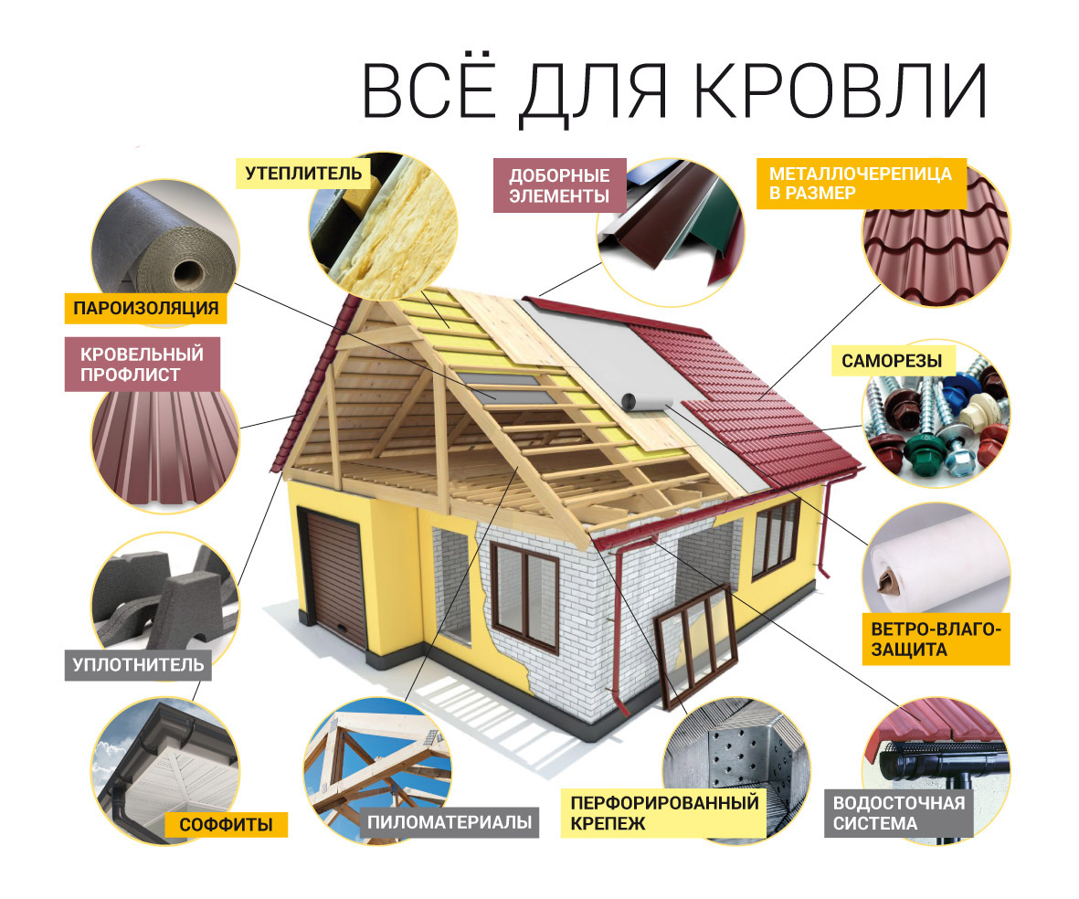 То есть нужно взять модель дома (можно не придумывать какой-то уникальный) и показать на нем составляющие (выноски с фотками и подписями это все мы сами) так же с забором, водостоком и прочим.