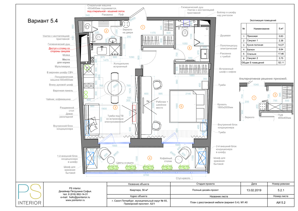 Рабочая документация для однокомнатной квартиры 52 м2.