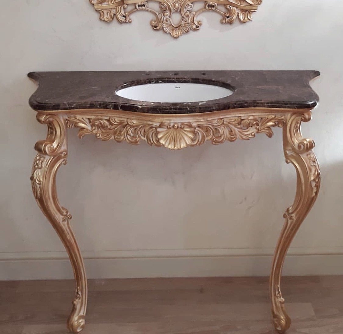 Необходимо разработать 3D визуализацию туалетного столика с умывальником и зеркало в резной раме. Предметы имеют множество декоративных элементов (резьба).