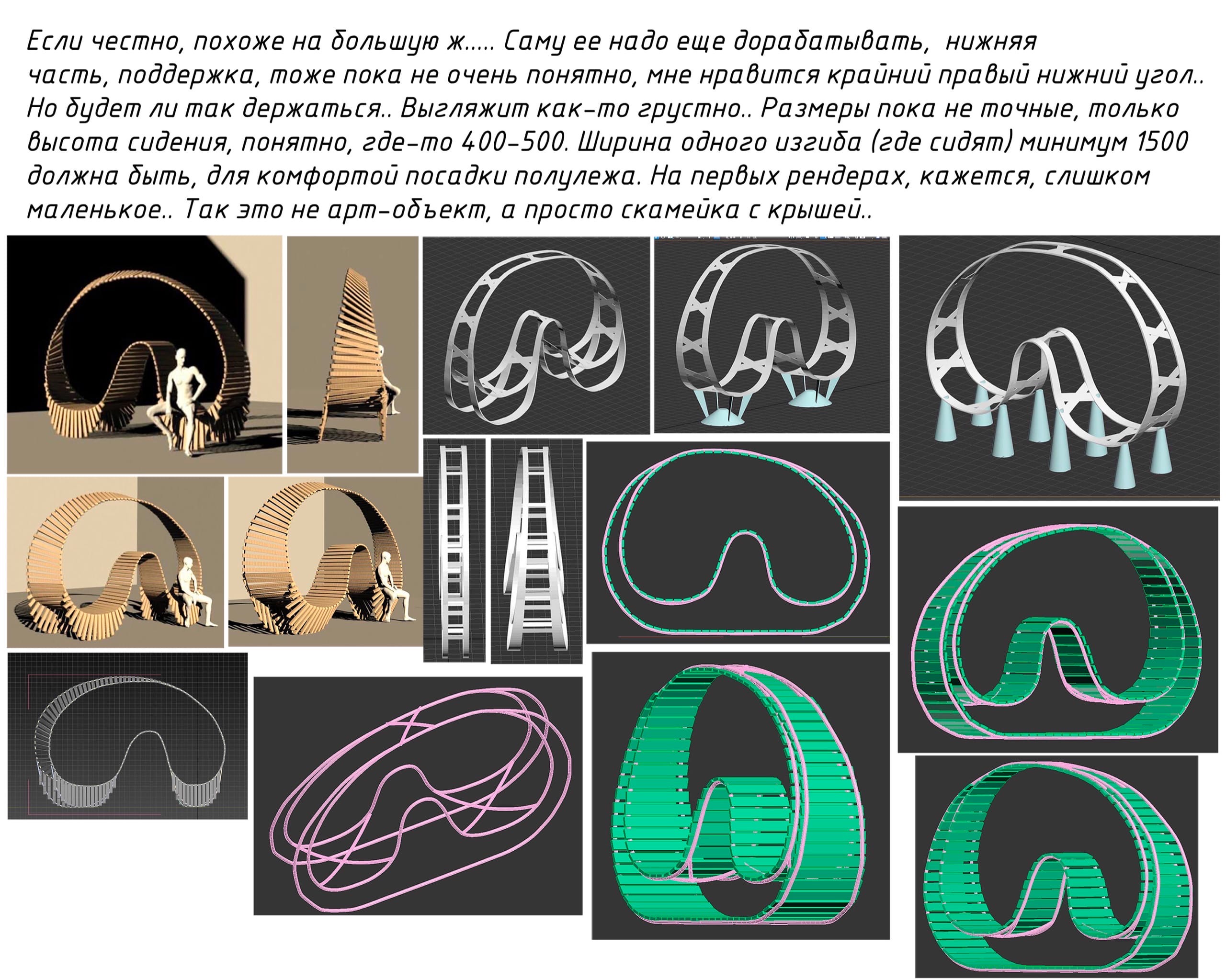 Задача - смоделировать дерево, массив. Скорее всего я сама буду делать форму из металла, внутреннюю часть - так как надо будет это с преподавателем обсуждать, а он постоянно вносит правки, а затем его надо будет "одеть" в дерево, прям имитируя разные кусочки массива, что бы они были естественно природные.. Это скамья, но как бы и скульптура..То есть заказчиков привлекла эта кривизна и перекосы ( приложила первую подачу, это курсовая, там я просто сфоткала макет и все) По карандашным скетчам должно быть понятно, что именно надо с деревом сделать..