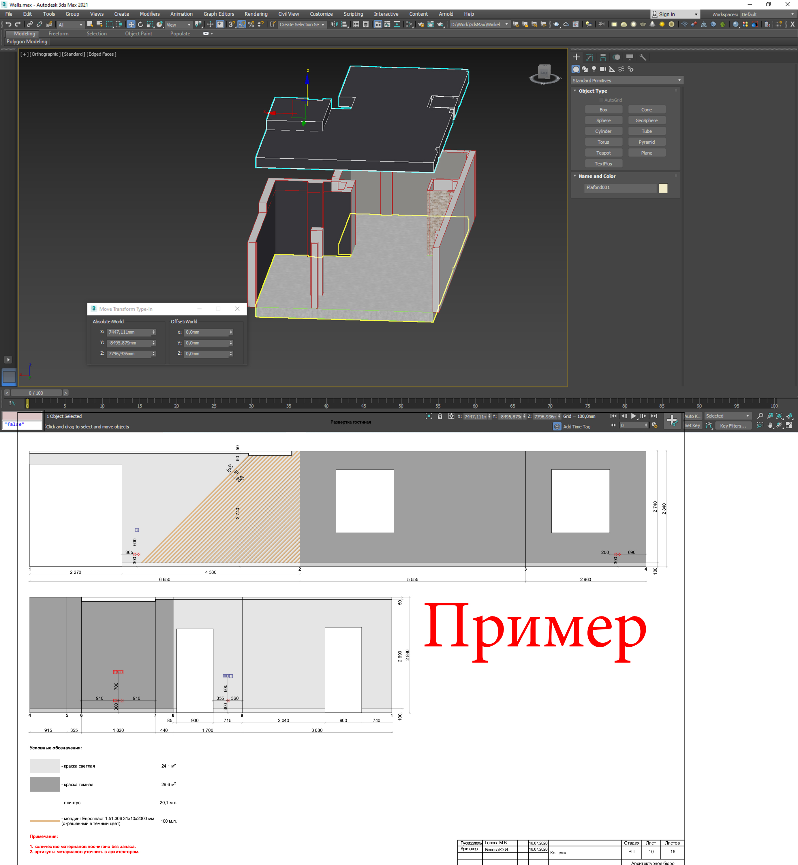 Из 3ds Max сделан экспорт стен потолка и пола. нужно сделать развертку стен, с условным указанием типа обработки (штукатурка, кирпич,...) и нанести размеры. по полу и потолку только размеры.
