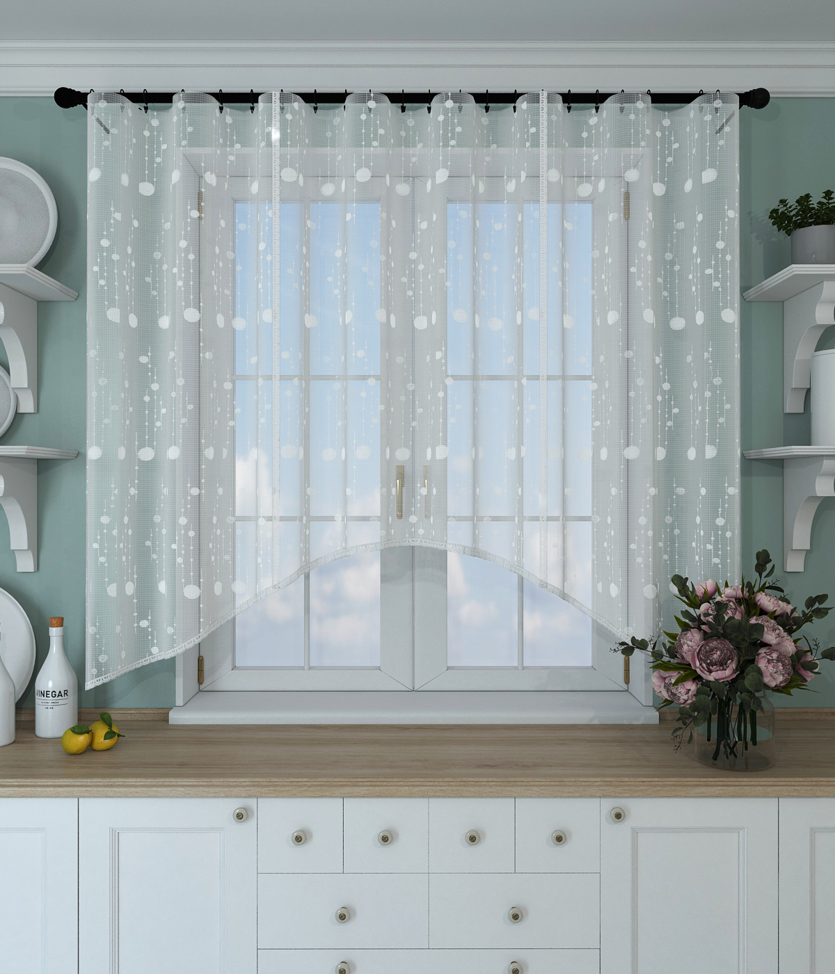 Сделать фото реалистичную визуализацию зоны окна. Штору залить текстурой тюля. Подобрать оптимальный фон и свет за окном, свет в комнате для контрастного выделения шторы на фоне интерьера и четко видимого рисунка ткани (тюля). Скорректировать цвет окружающих предметов для контрастного выделения шторы.