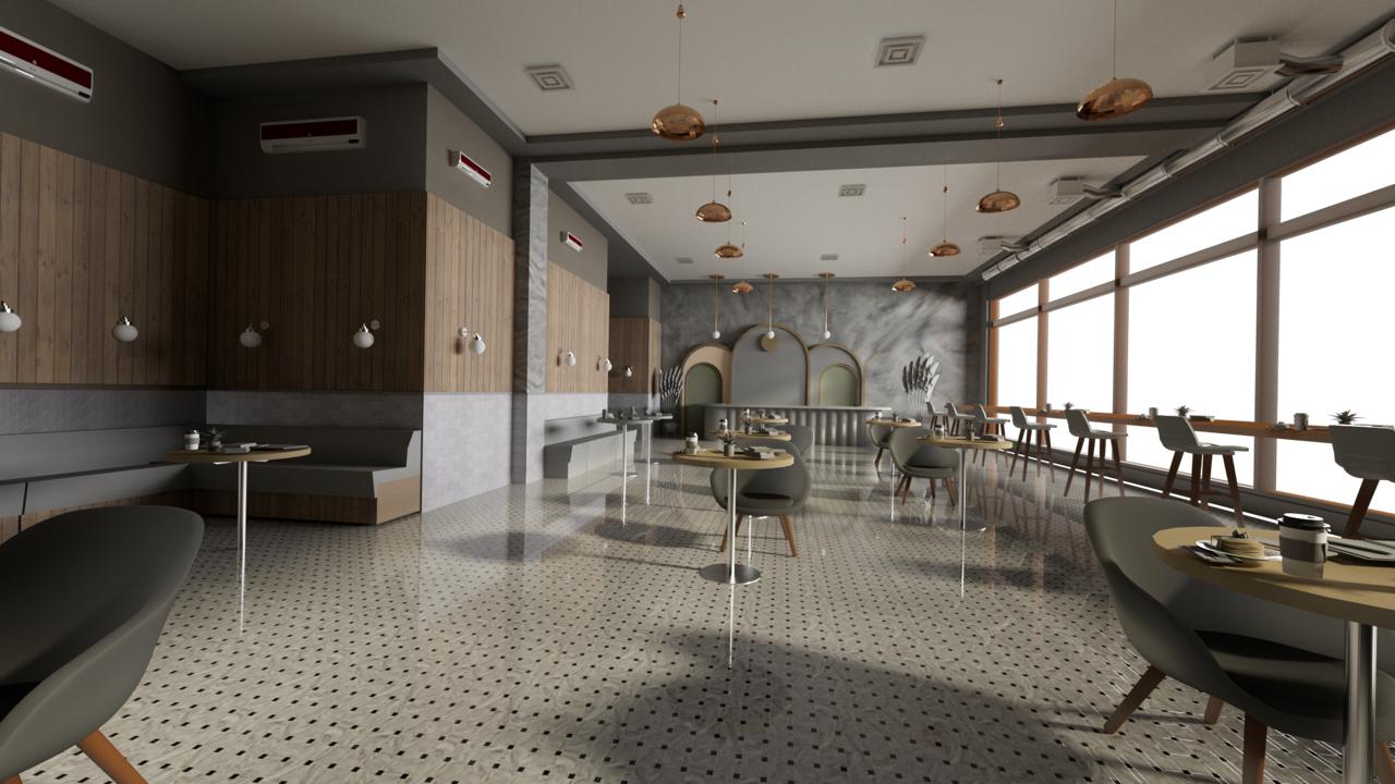 Необходимо доработать интерьер кафе (геометрию и детали). Сцена с основой и анимированной камерой готова в Синеме. Посчитать визуализацию по готовой камере.