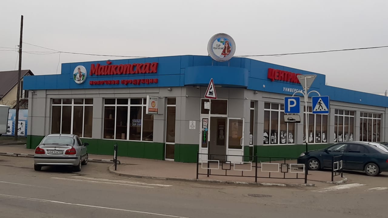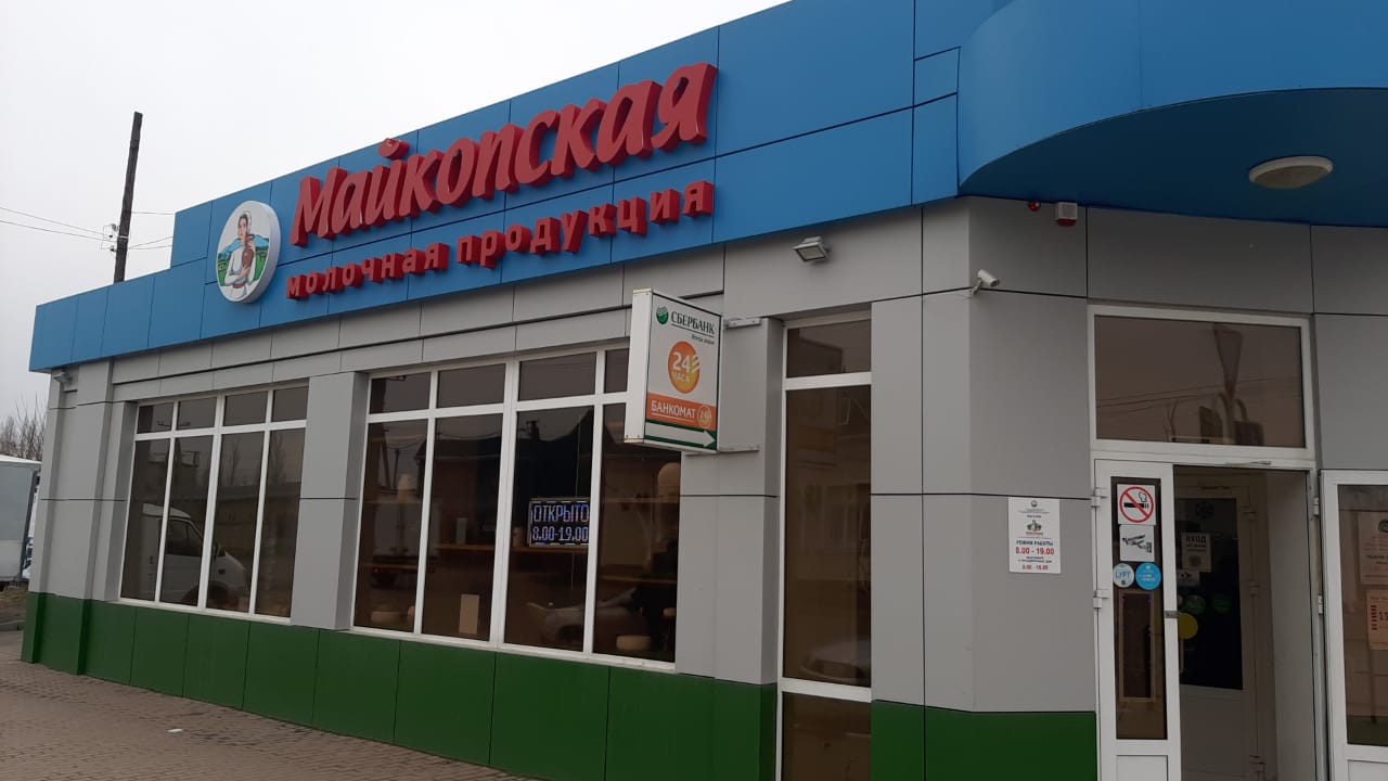 Обязательно световая вывеска с надписью : «Майкопская молочная продукция» и девушка с кувшином (наша торговая марка -Майкопская молочная продукция). Наш слоган: «натуральная, свежая, любимая».