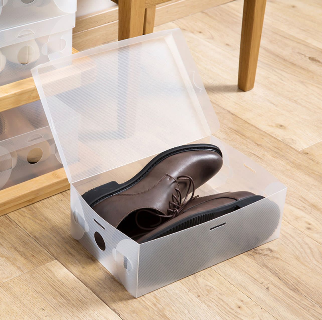 Коробка в разложенном виде, как коробка складывается. Вид обзора коробки. Коробка с разной обувью в интерьере. Коробка с размерами. Коробки в шкафу. Пример видео по ссылке