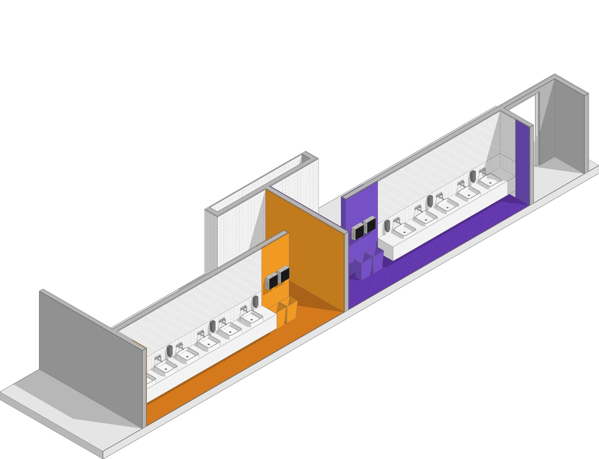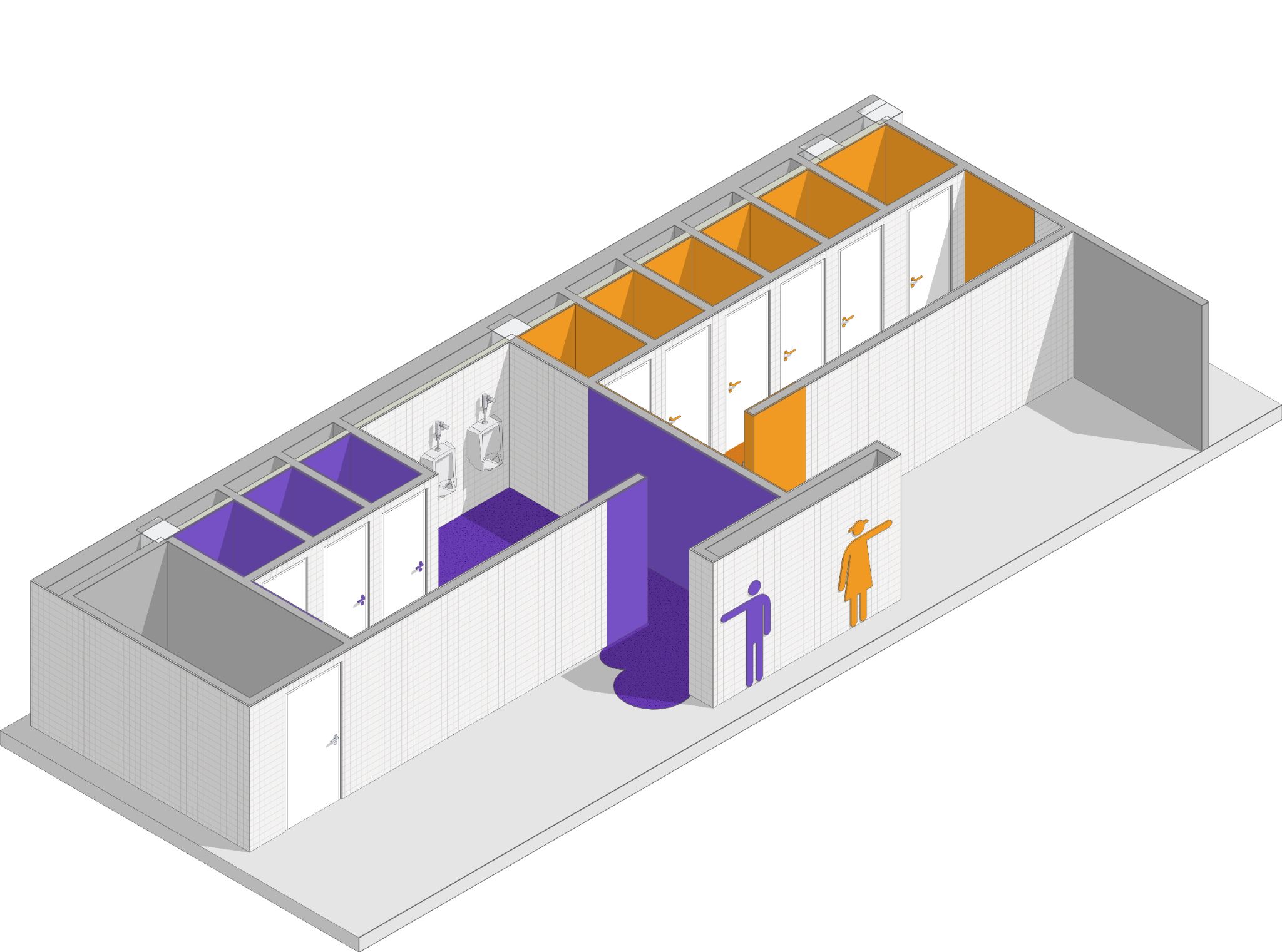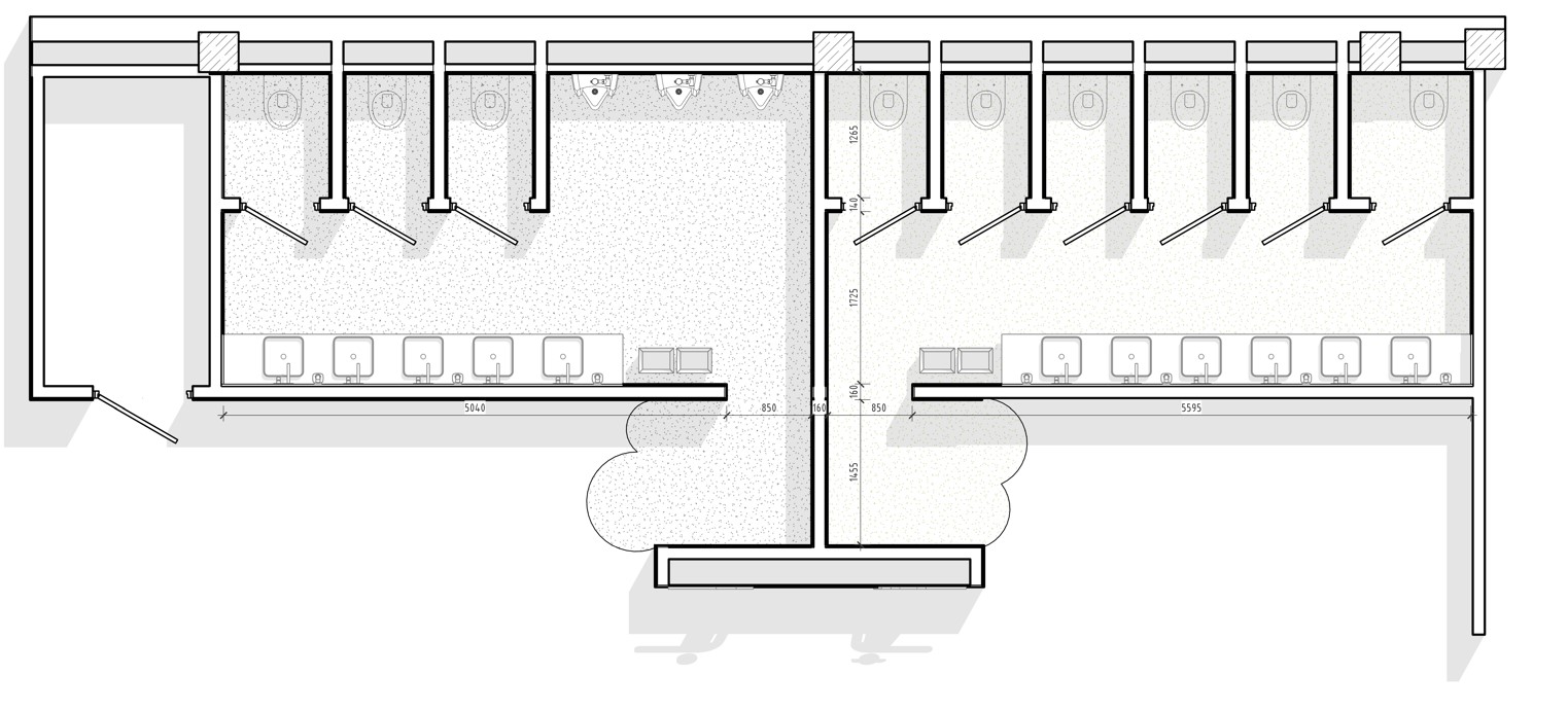 Необходимо выполнить визуализацию пяти общественных туалетов в одной стилистике.